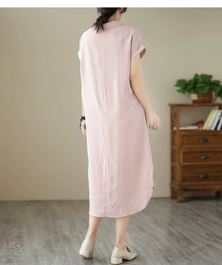クリアランスリーク〜eseスタイルのオリジナルシングル気質ラペルリネンシャツ薄いロングスカートレディースルーズコットンとリネン半袖ドレス sine28429717436