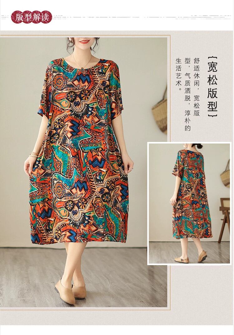 ディスカウントストアショッピングモール撤退女性のエスニックスタイルプリントコットンとリネンドレスルーズスリミングラウンドネックリネンロングスカート Oネック sine9542989367