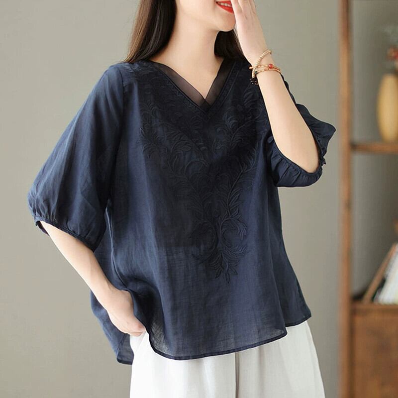 Eign Trade Export Big Tail Goods 撤退レディース刺繍 V ネックコットンとリネンシャツルーズで軽いリネン半袖 T シャツトップ レッド Vネック Tシャツ sine19676721552