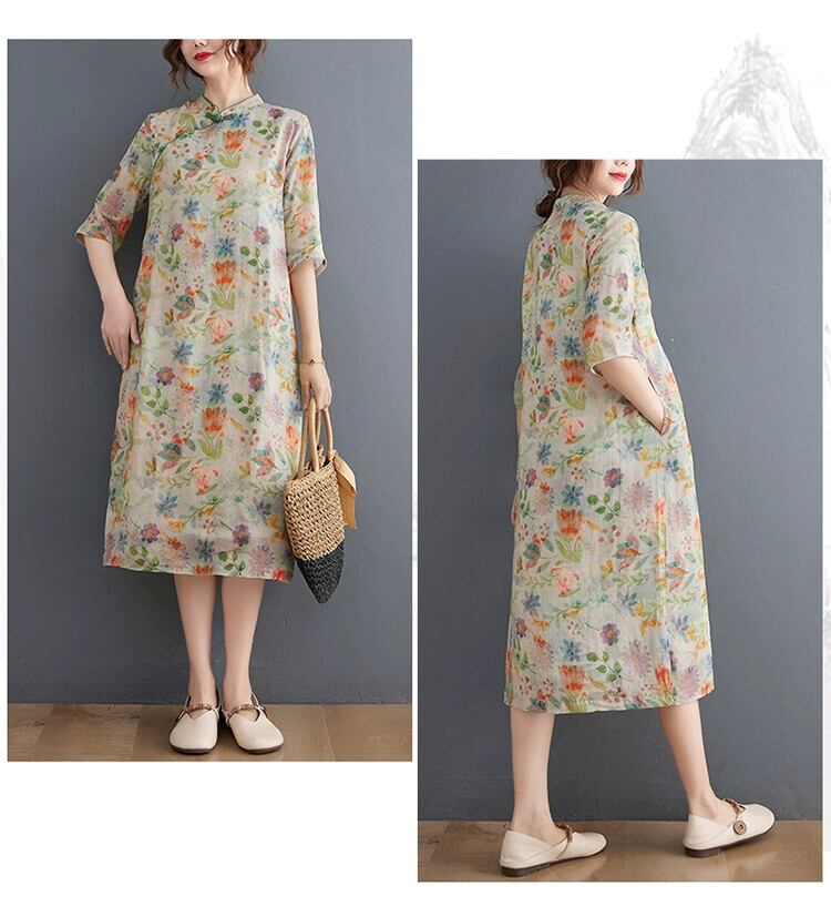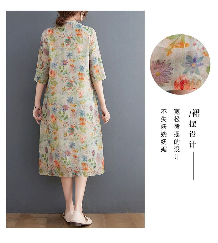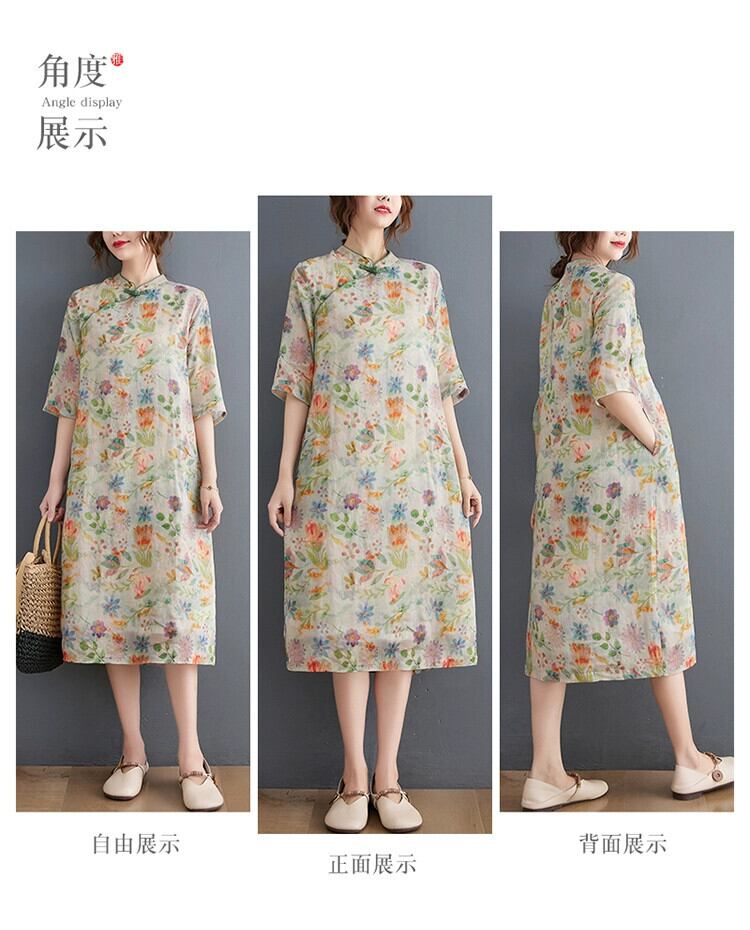 Eign Trade 輸出ブランドテールグッズ女性の中国風プリントラミーチャイナスカート斜め前立てプレートボタンスタンドカラーリネンドレス sine13332456338