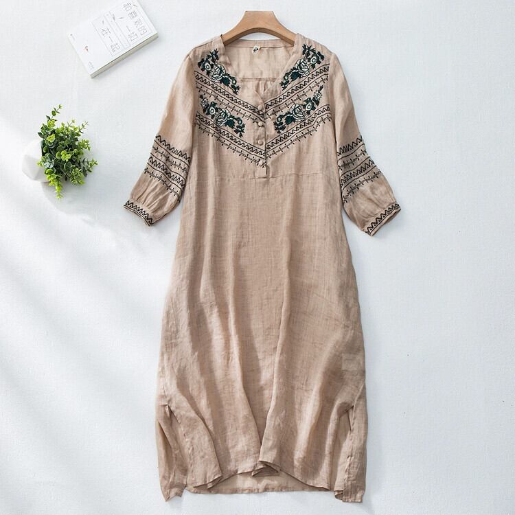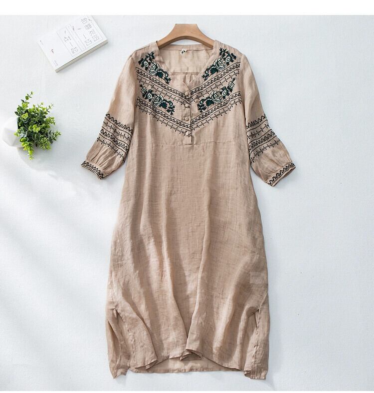 クリアランスリーク〜eseオリジナルのコットンとリネンの半袖ドレス、ゆったりとしたレトロな刺繍入りVネックカジュアルラミーミモレ丈スカート レッド sine2818134891