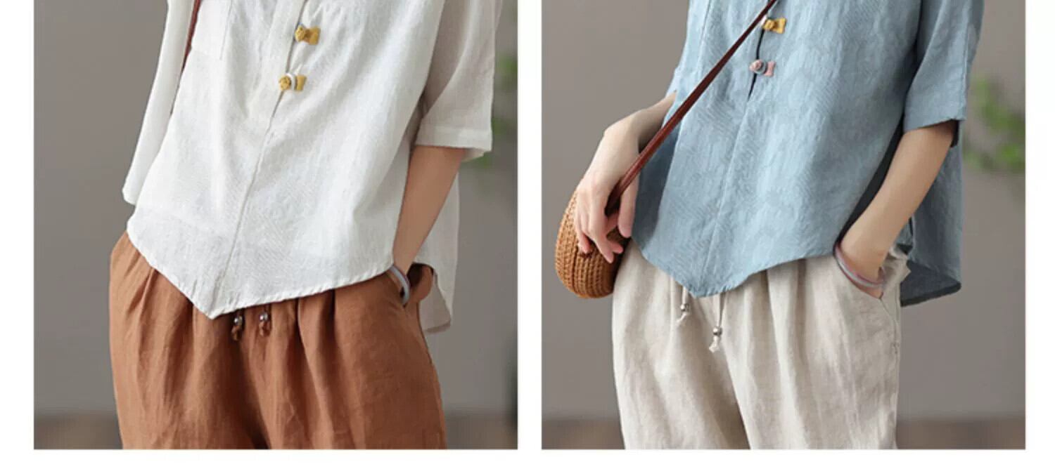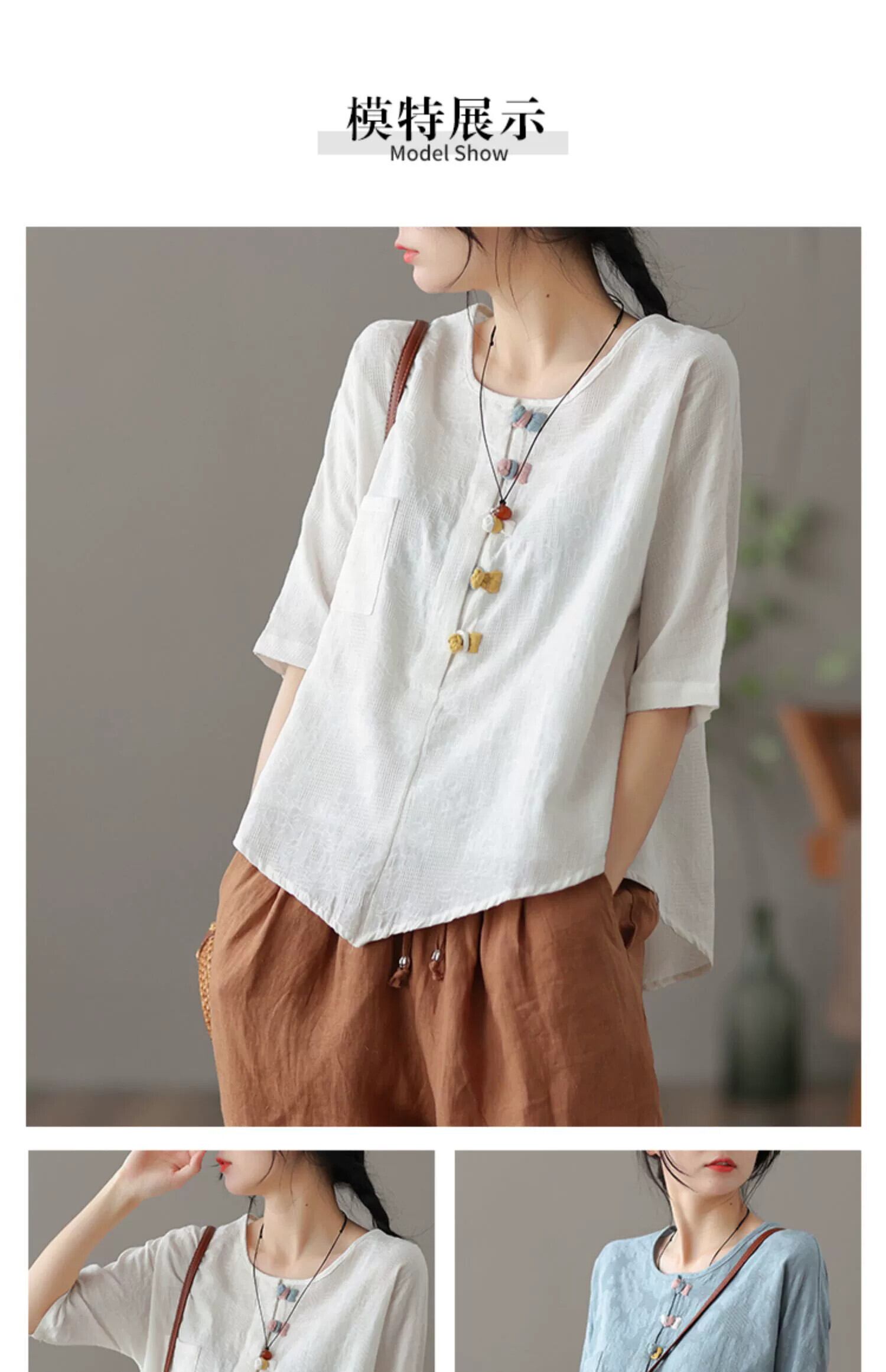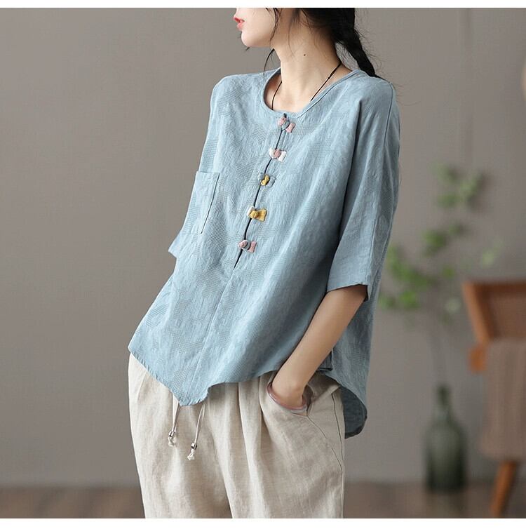 クリアランスリーク〜eseオリジナルの単一文学綿とリネンの半袖シャツの女性、ゆったりとしたレトロな中国のボタンアップリネントップ コットン sine44904260018