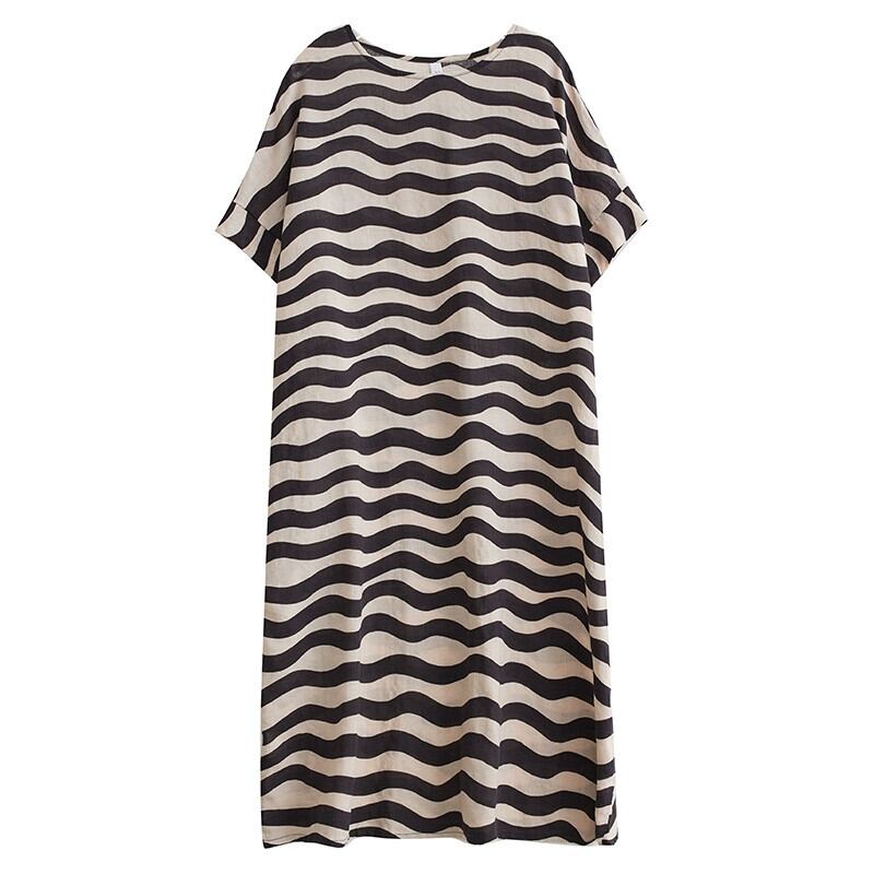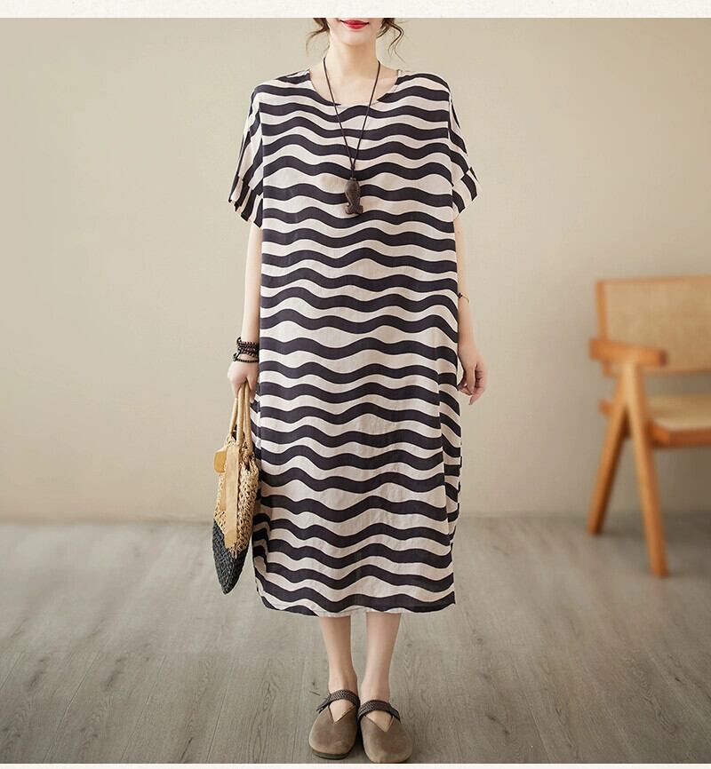 クリアランスリーク〜eseオリジナルのシングルコットンとリネンの半袖ドレスの女性、ルーズなプラスサイズの太いmmの波状ストライプのミドル丈スカート 大きめサイズ sine91702363849