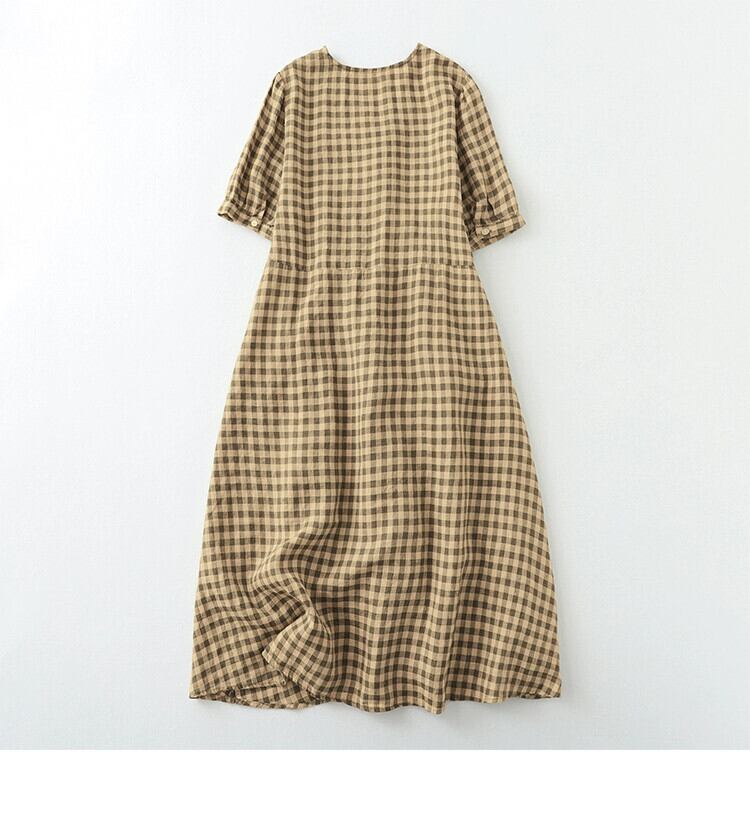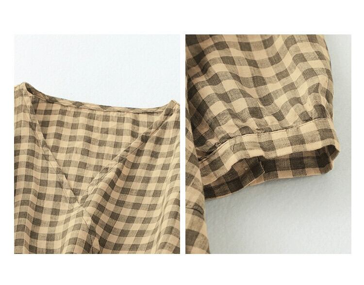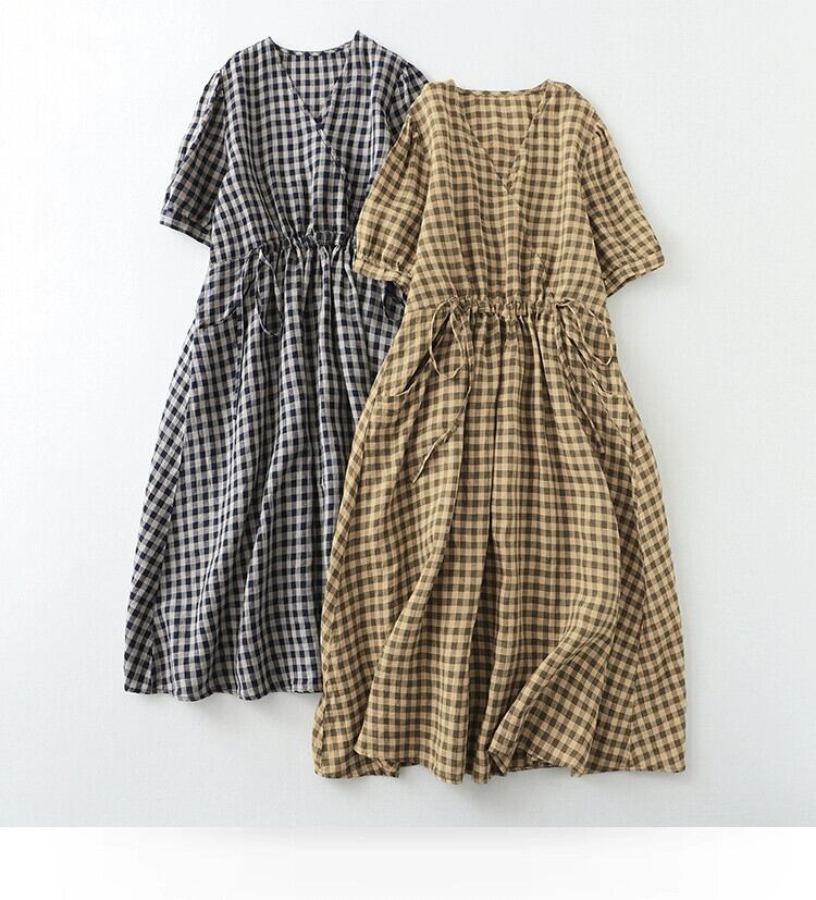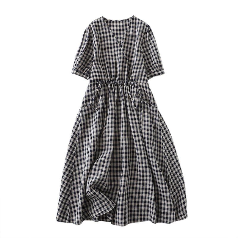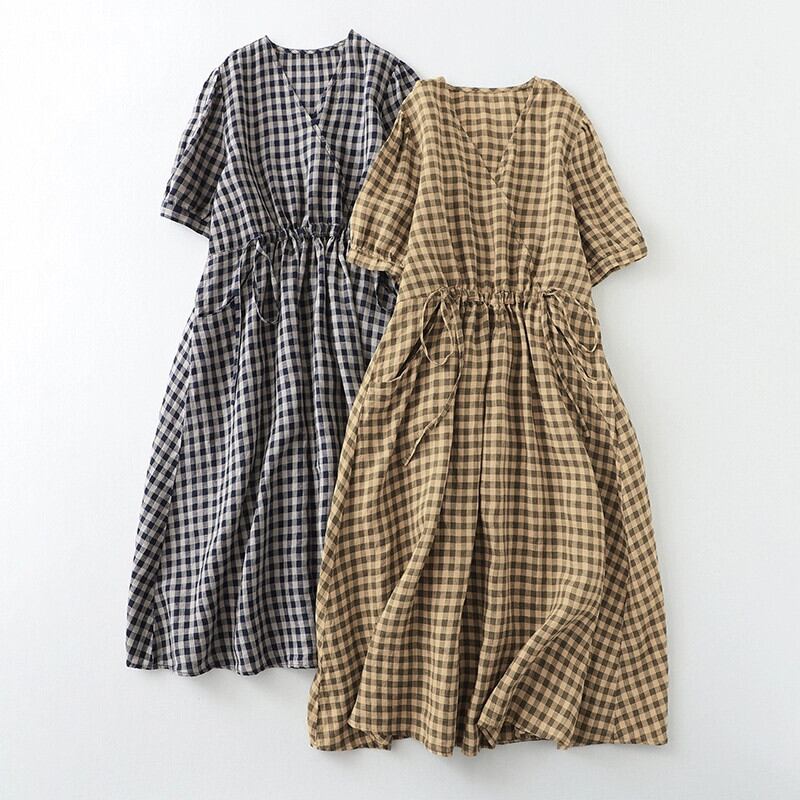クリアランスリーク~eseオリジナルリネンチェック柄Vネックワンピース夏ウエスト絞り綿麻Aラインミモレ丈スカート コットン サマー 夏物 sine10522795806