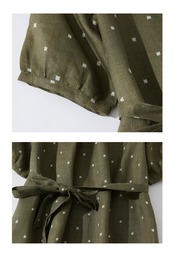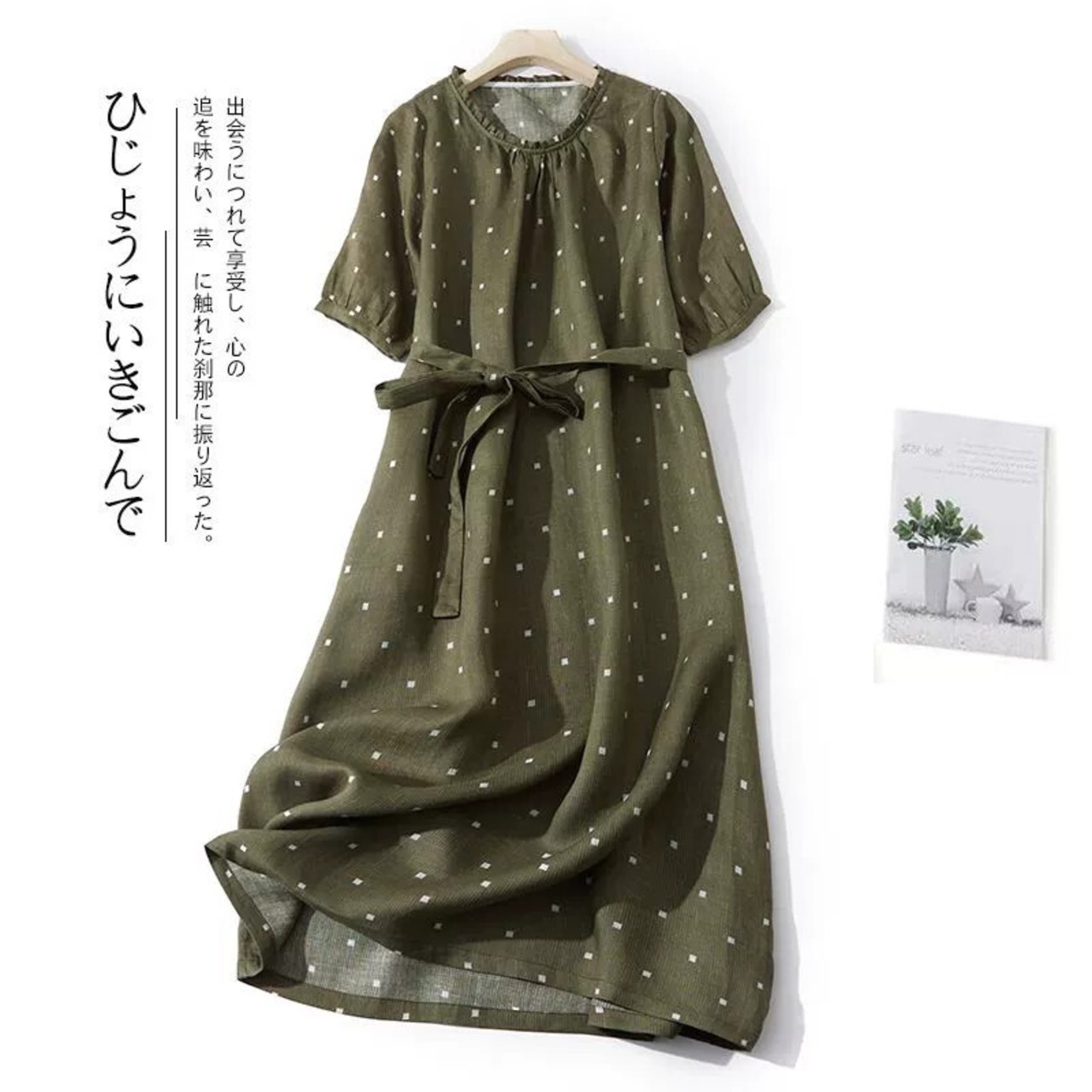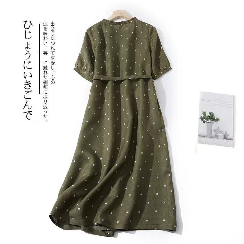 eseオリジナルシングルエイトトレードビッグネーム水玉リネン半袖ドレスルーズウエストレースアップ綿麻Aラインミモレ丈スカート コットン sine13700592748