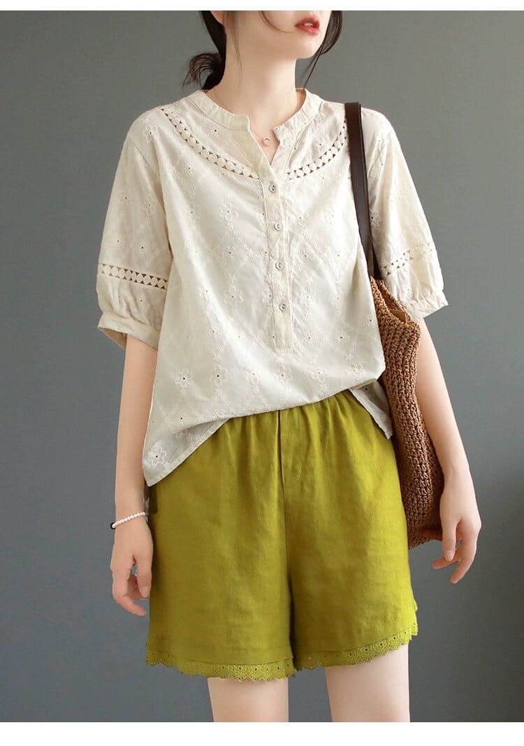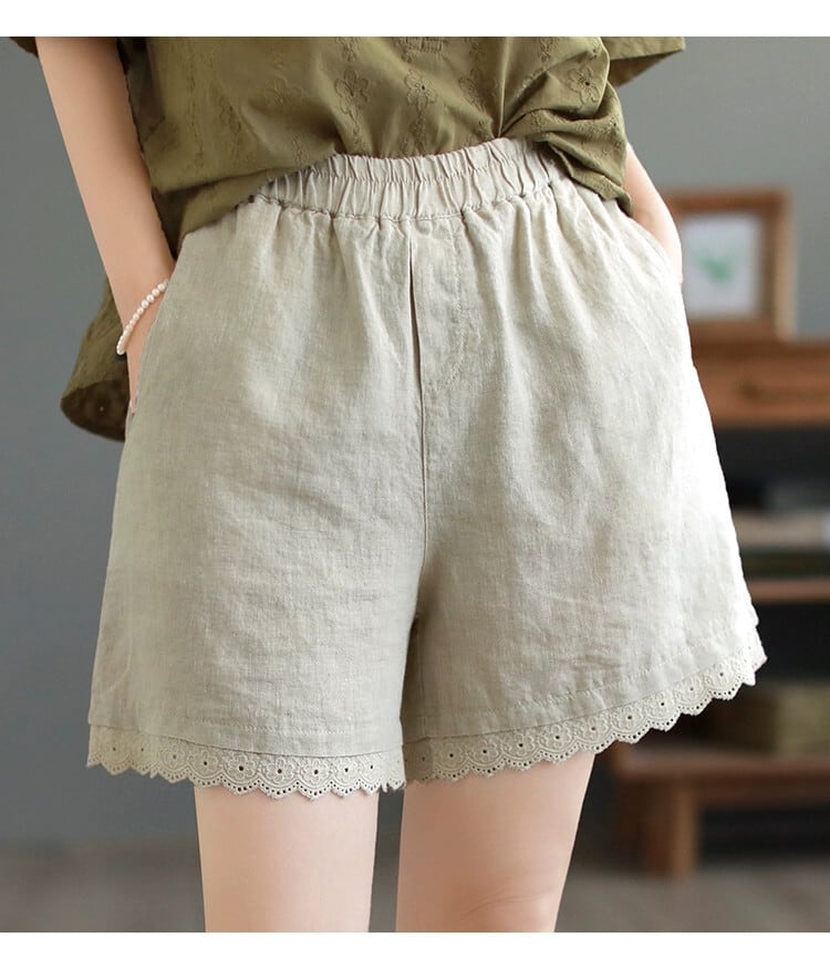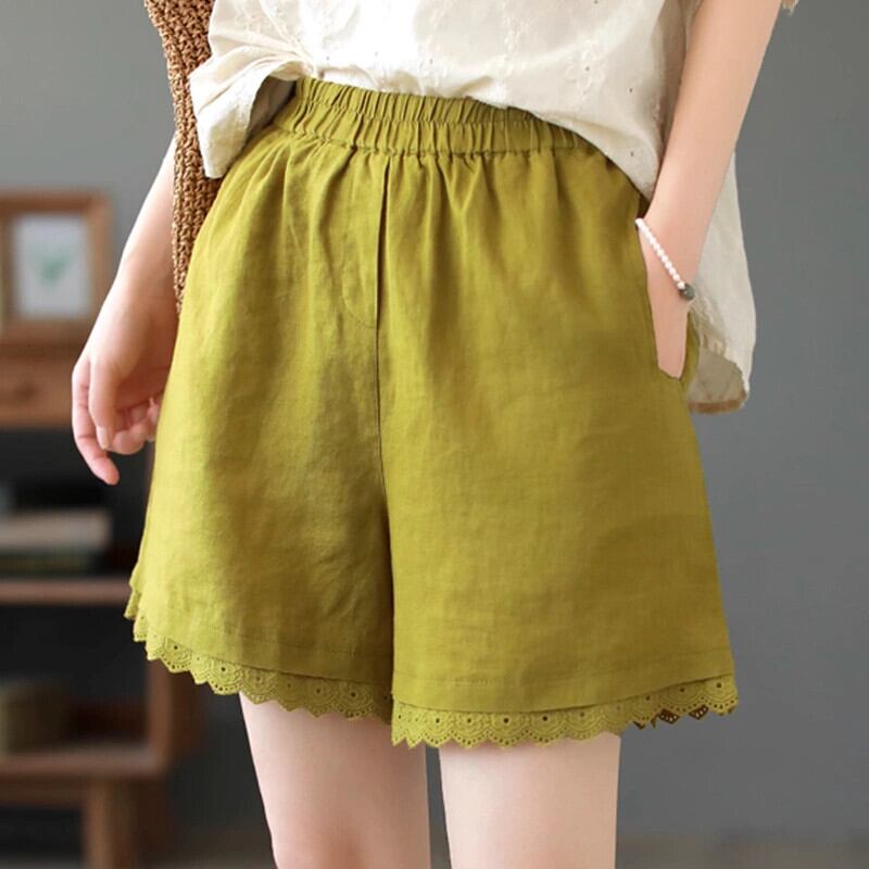 Eign Trade Export Tail Goods レトロレーススプライシングコットンとリネンワイドレッグショーツ女性ハイウエストカジュアルリネン七分パンツ ブルマー sine61604934900