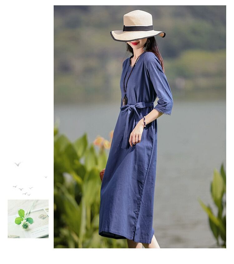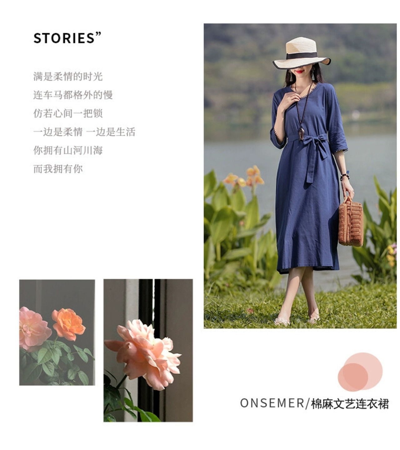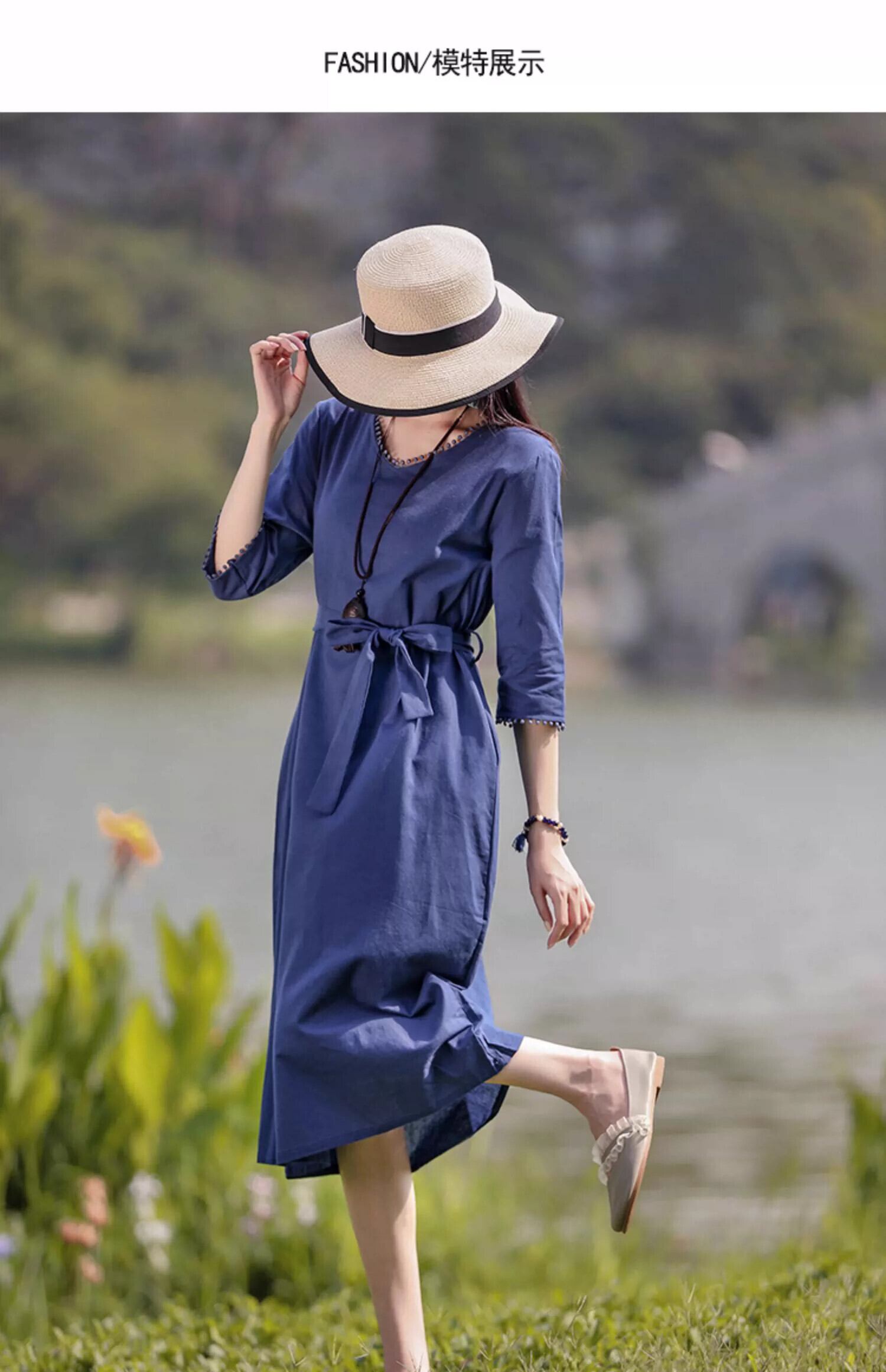 Eign Trade Counter ブランド テール グッズ レディース レトロ コットンとリネン V ネックドレス 夏ウエスト絞りリネン A ラインミドル丈スカート サマー 夏物 Vネック Aライン sine27726940360