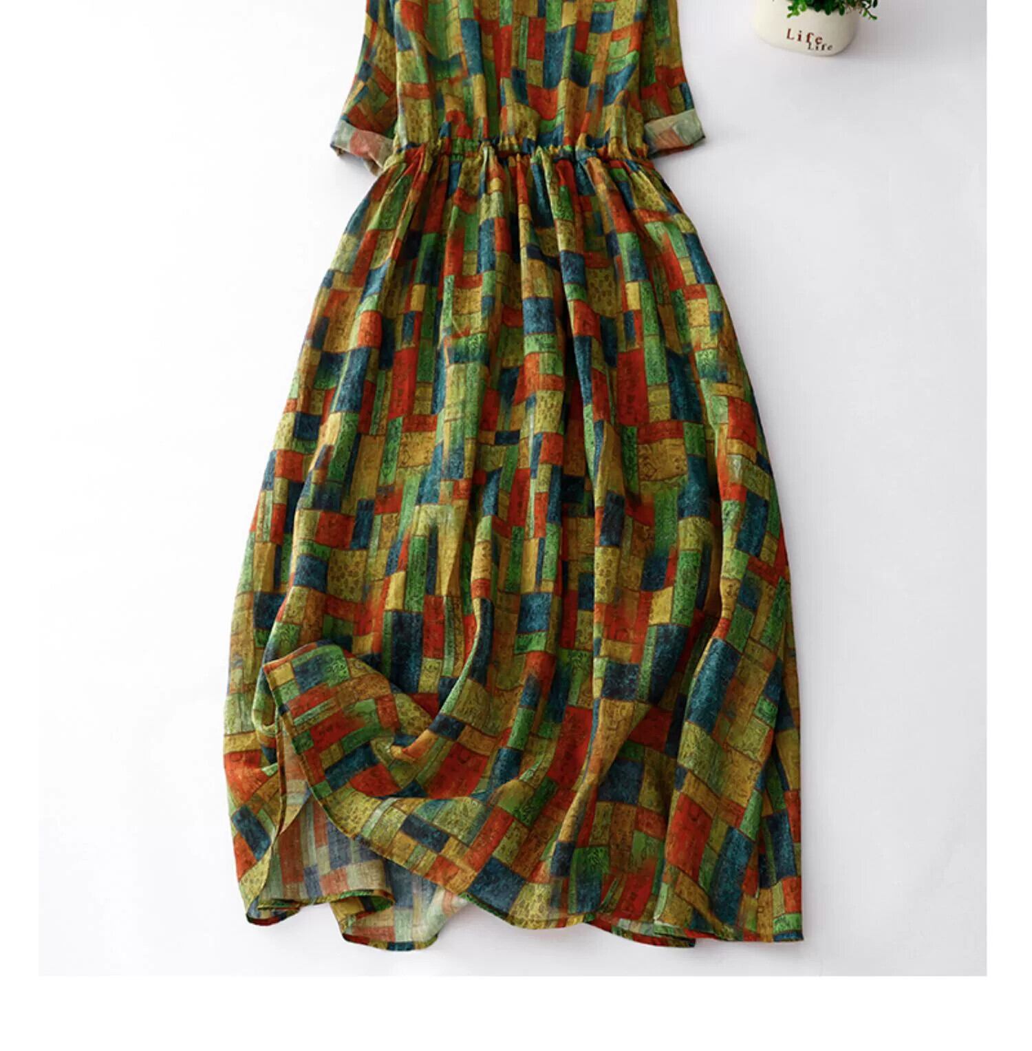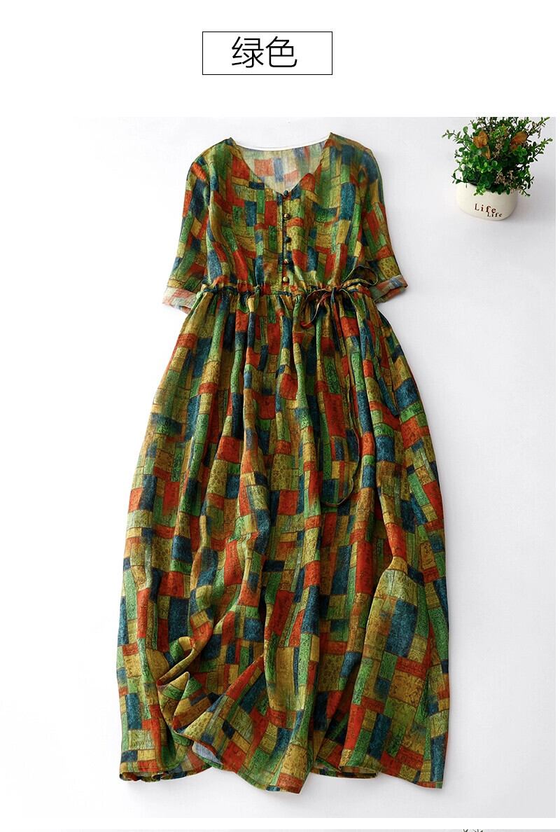 eign trade ese オリジナルハイエンドブランドレトロカラーブロッキングプリントコットンとリネンドレスウエストレースアップリネンスカート sine36542132006