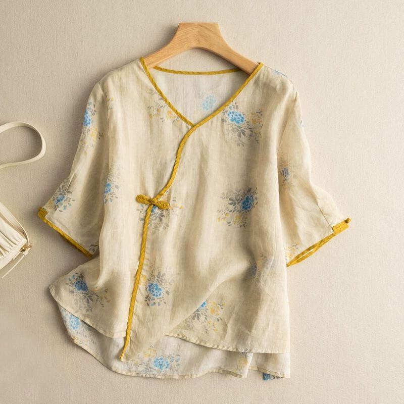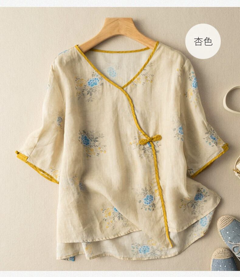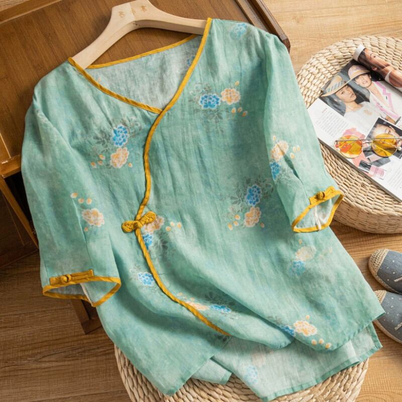漏れを拾ってください!カウンター引き出しの有名なシングル女性のレトロなチャイニーズ バックル ラミー トップ ルーズ花柄コットンとリネン シャツ sine71109500763