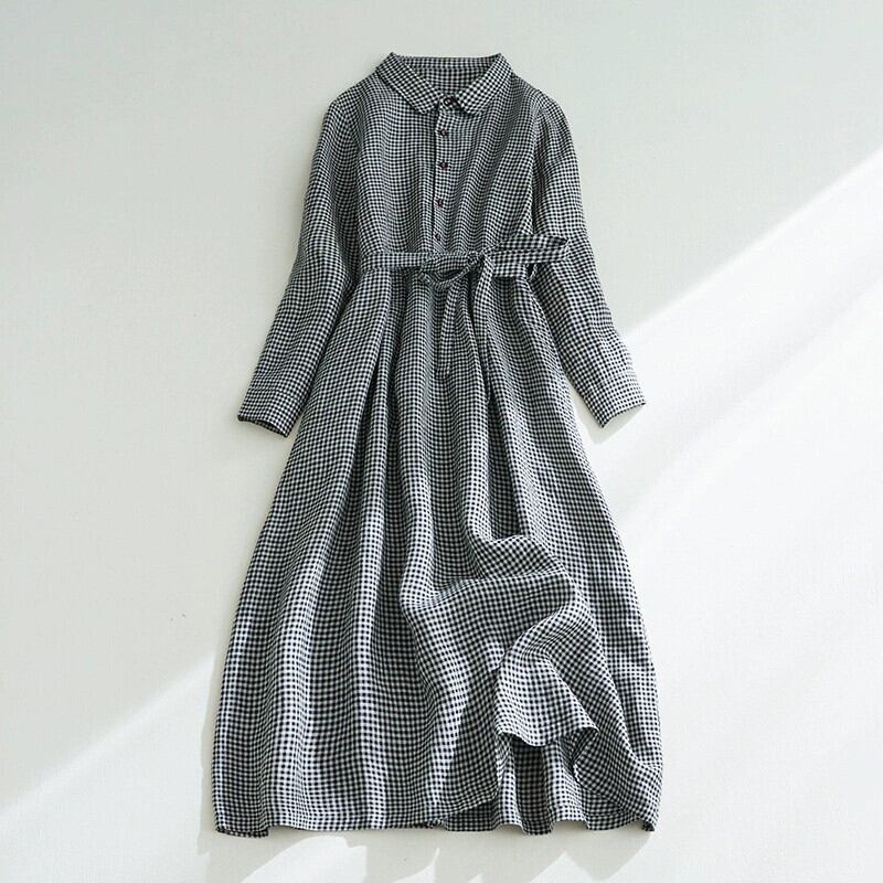 有名ブランドの在庫切れレディース リネン チェック柄シャツ ロング スカート ルーズ レースアップ コットンとリネンの長袖ドレスのクリアランス カウンターの削除 sine50554490214