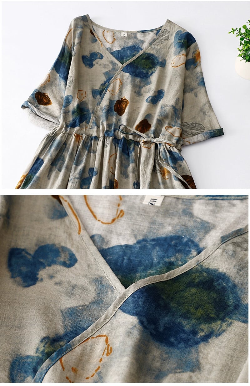 クリアランスハイエンドテールグッズレディースラミープリントドレスウエストタイVネックリネンロングスカート sine59486045116