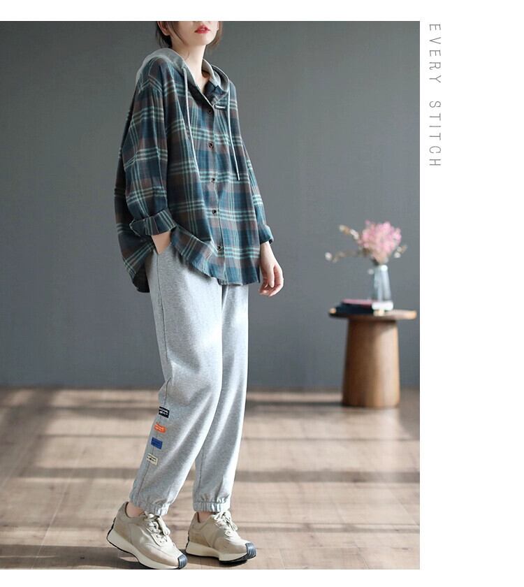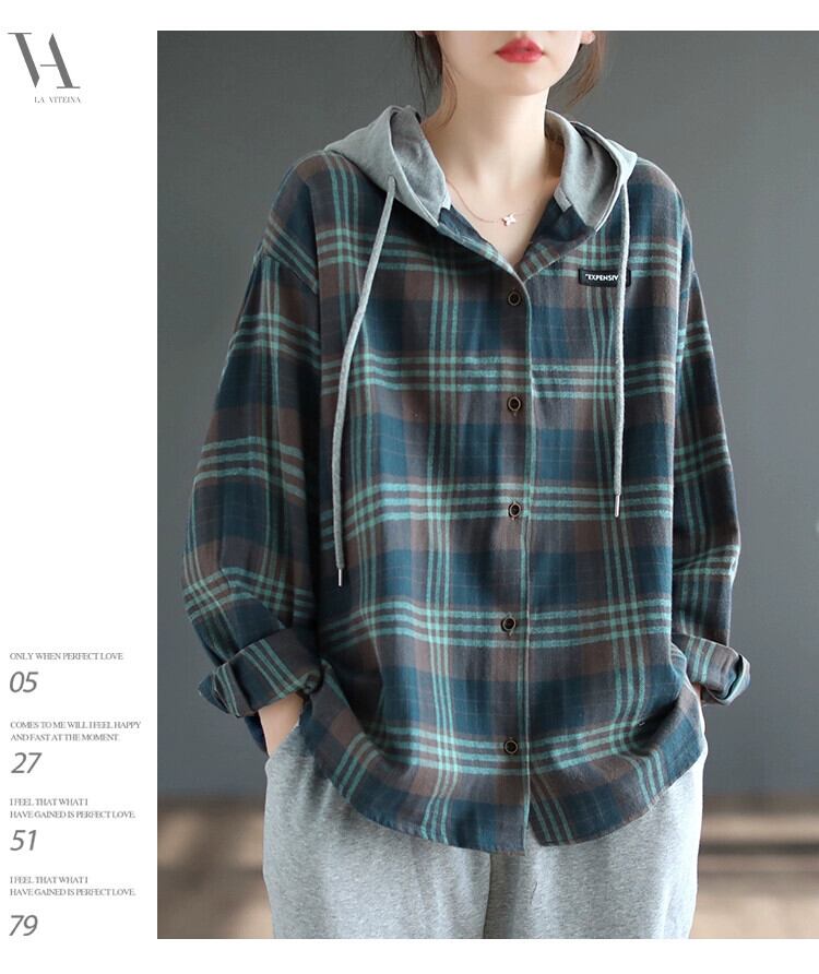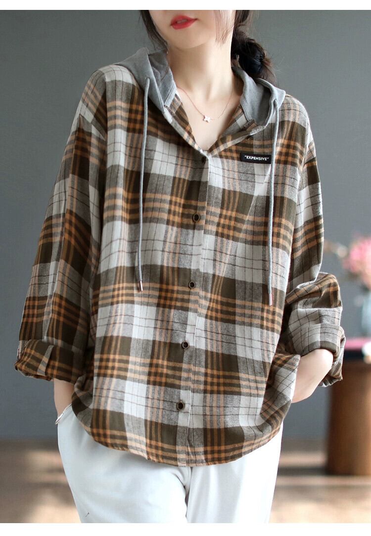 eign trade ese オリジナルオーダーキャビネットから出すカジュアルレトロチェック柄長袖レディースシャツルーズ起毛フード付きスウェットシャツジャケット ロング sine19634134516