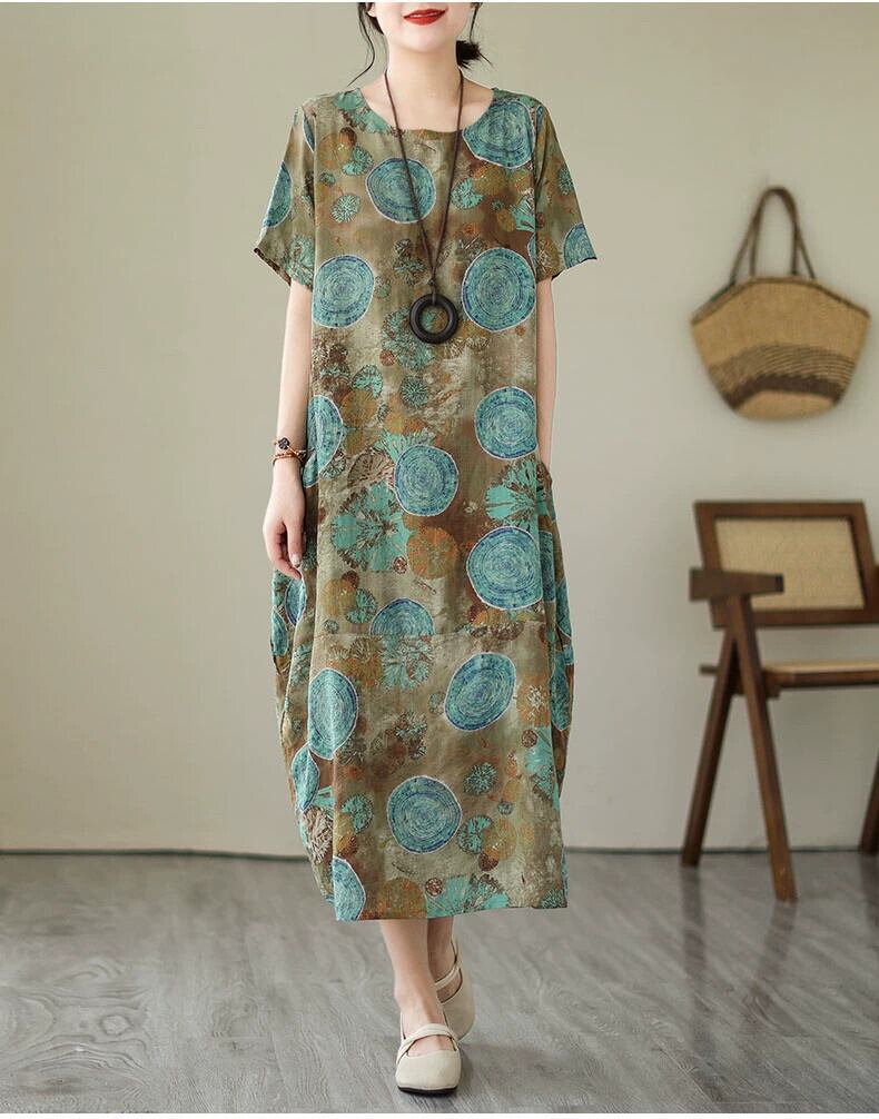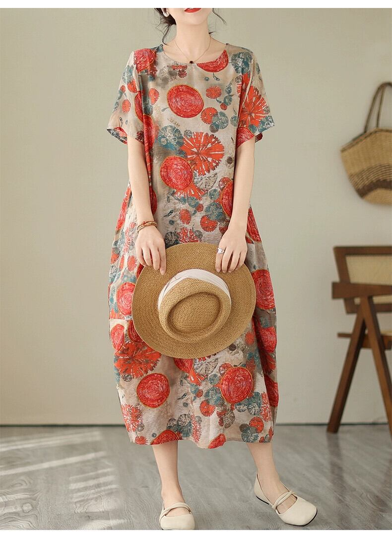 クリアランスリーク〜既製の女性用レトロプリントコットンとリネンのドレス、ゆったりとした大きいサイズのリネンの膝丈のローブ 大きめサイズ sine75256719106