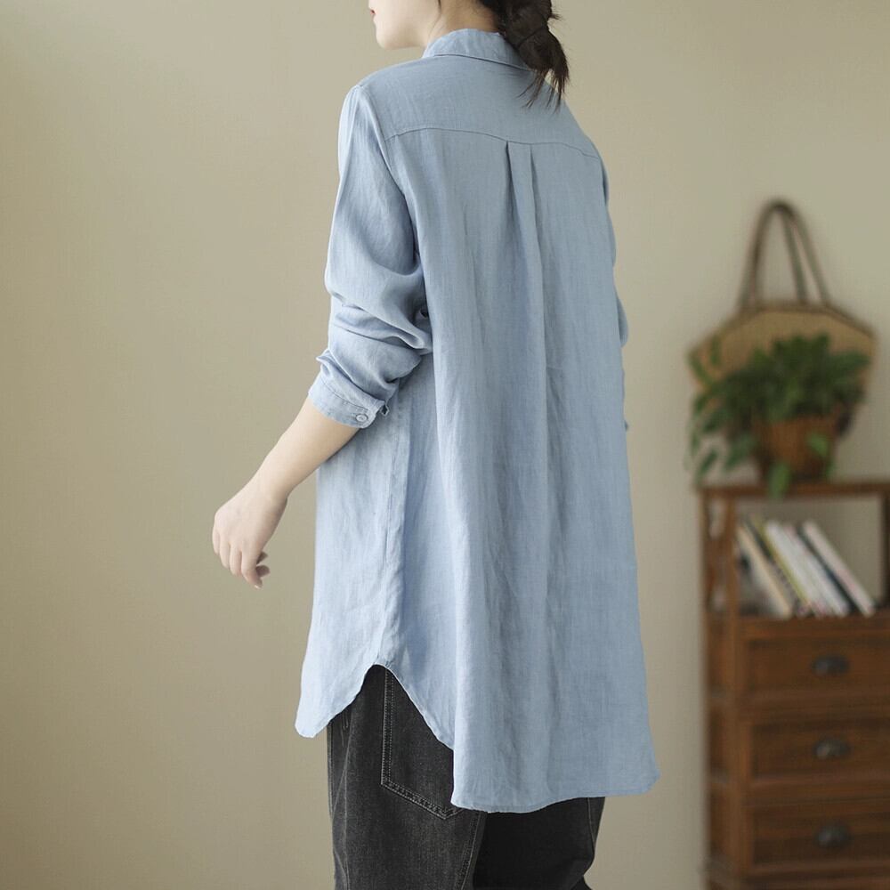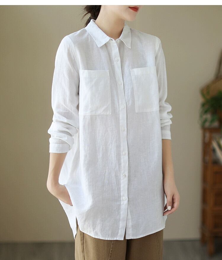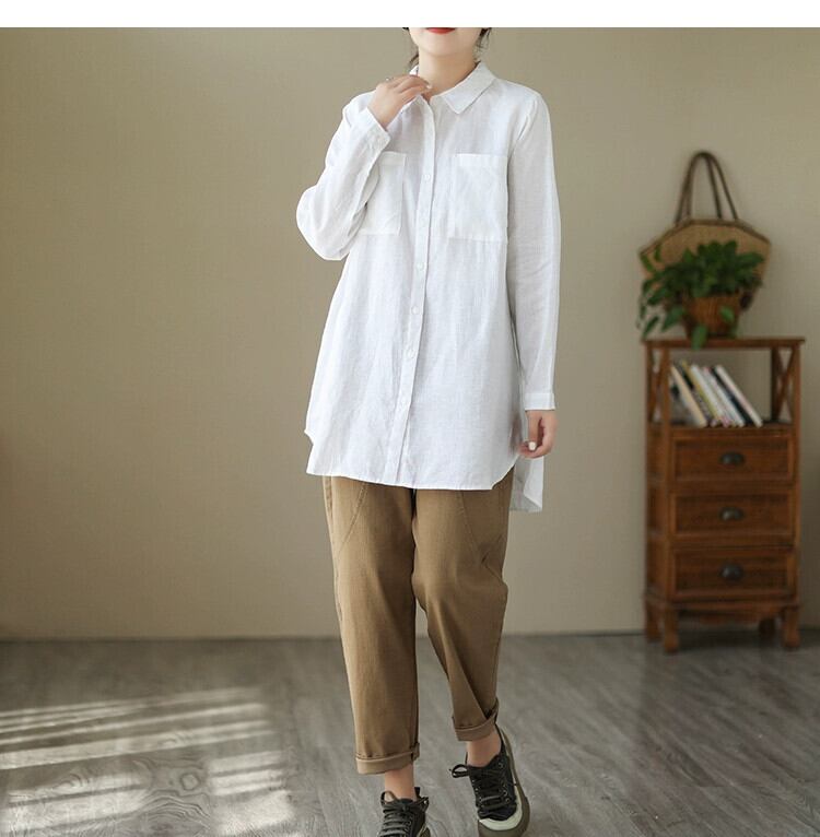 ショッピングモールの有名人がカウンターから商品を引き出しました。女性のカジュアルな文学的で芸術的な綿とリネンの長袖シャツ、ルーズなミドル丈のリネントップです。 ロング コットン sine2921881888
