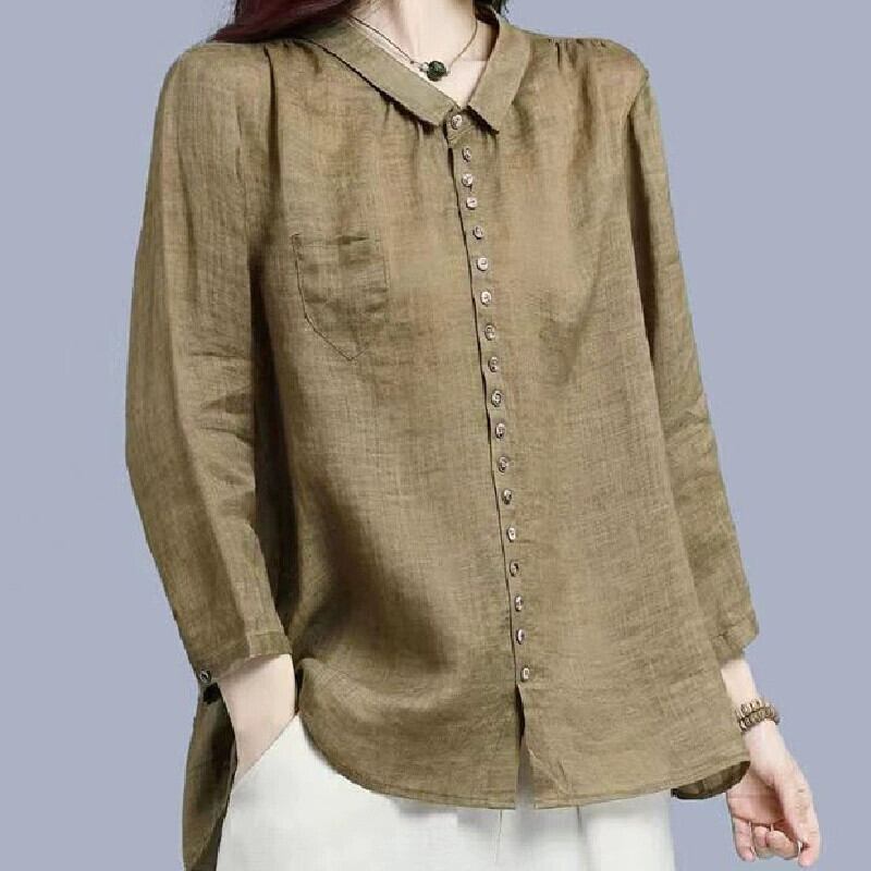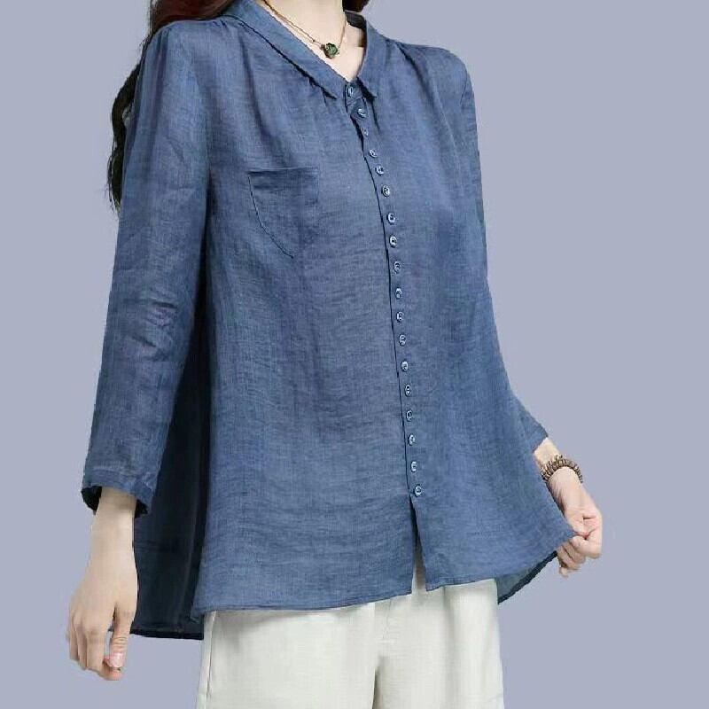 クリアランス クリアランス eign 貿易カウンター引き出しレディース レトロ ラペル リネン トップ芸術的なシングルブレスト コットンとリネン長袖シャツ ロング sine72340559112