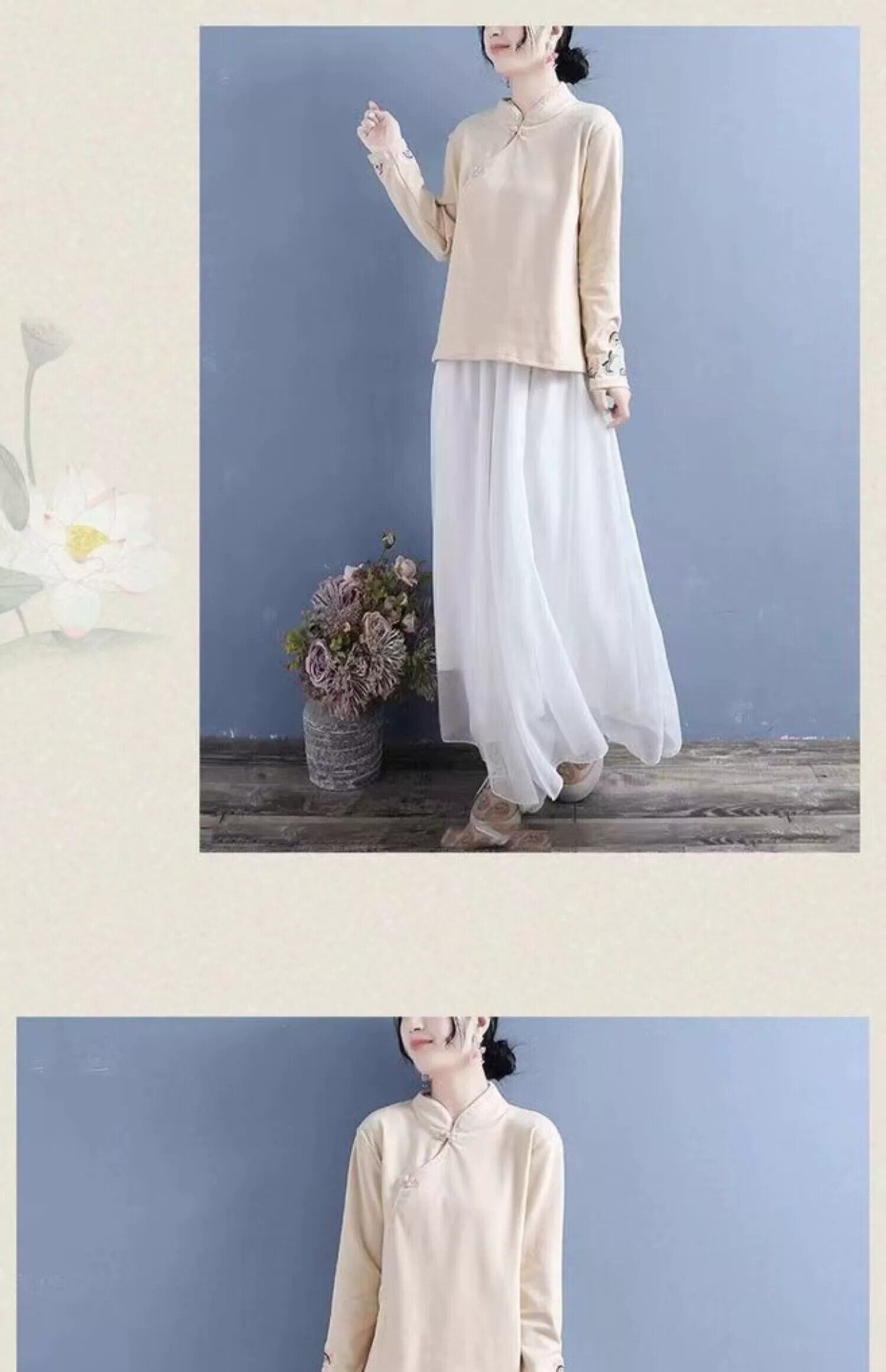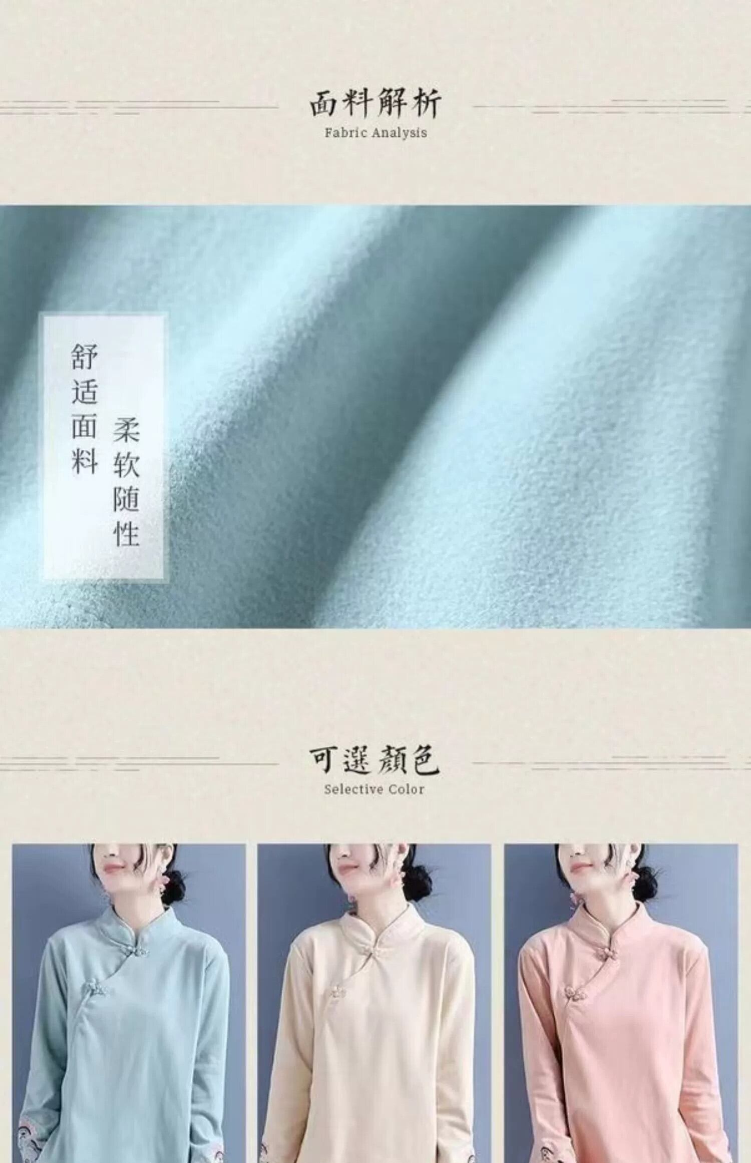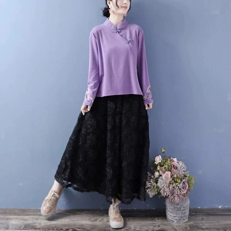 ディスカウントストアショッピングモールの女性の中国風刺繍ボタンティーシャツルーズスタンドカラー長袖トップ ロング レッド sine5599486681