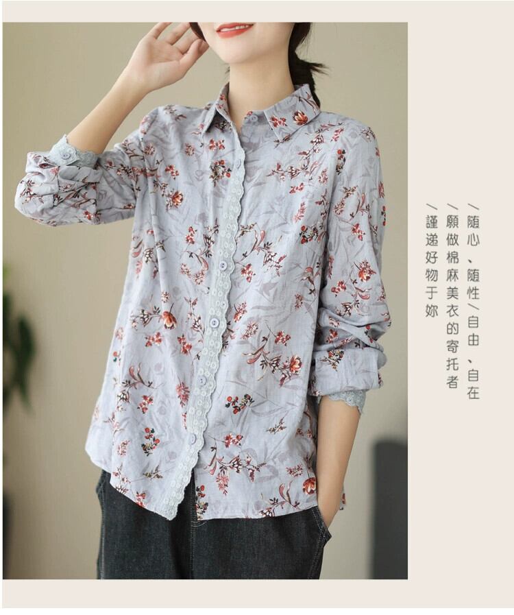 カウンタークリアランスクリアランスレディースフローラルレースコットンとリネンシャツルーズラペルリネン長袖トップ ロング 花柄 sine5071848346