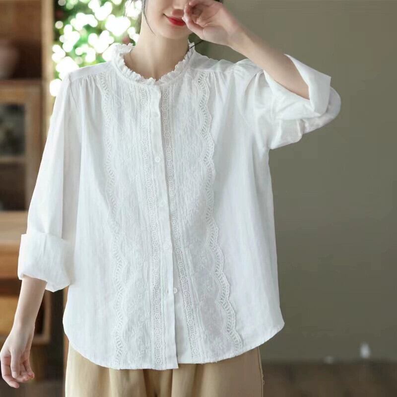 クリアランスリーク〜既製のレディースエストスタイルファンガスレースリネントップカジュアル刺繍コットンとリネン長袖シャツ ロング レッド sine78946995230