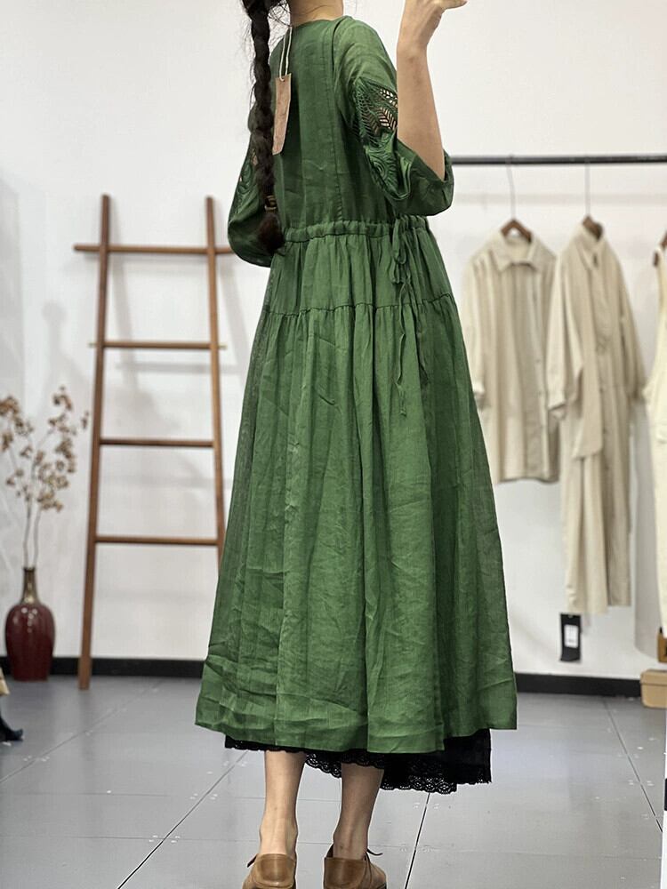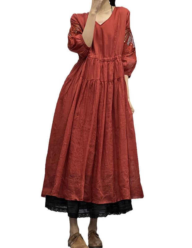 ディスカウントストアショッピングモールの女性の中空レースリネンドレスルーズハイウエスト V ネック綿とリネンのロングドレス ハイウェスト コットン Vネック sine33237197101