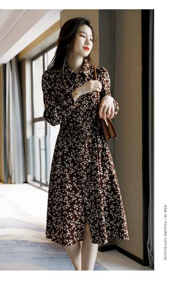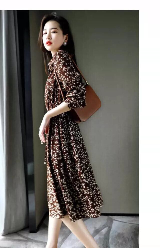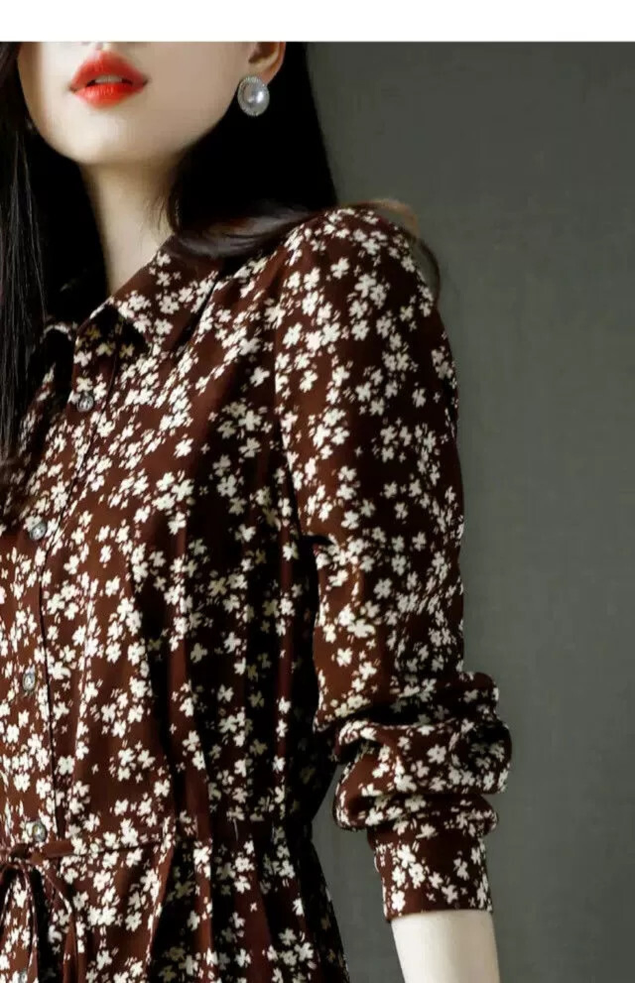 モールビッグネーム撤退最後の在庫女性の花柄ラペルミッドレングスシャツドレスウエスト長袖コットンとリネンのドレス ロング sine30155760278