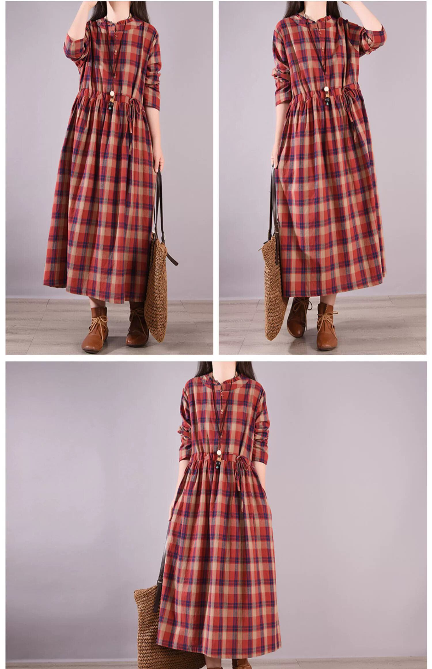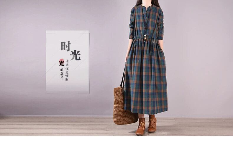 eign trade ese オリジナルハイエンド婦人服レトロウエストレースミッドレングススカート大きいサイズ長袖チェック柄綿とリネンのドレス ロング コットン 大きめサイズ sine13417341165