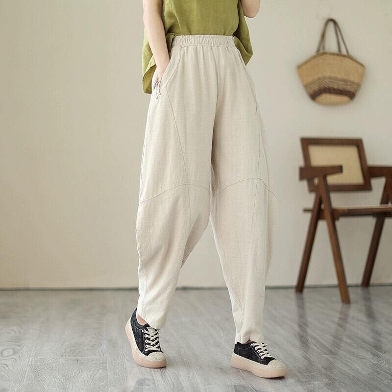 クリアランスリーク〜eseオリジナルのレトロなコットンとリネンのハーレムパンツの女性、ルーズハイウエストカジュアル9ポイントリネンキャロットパンツ sine78312661385