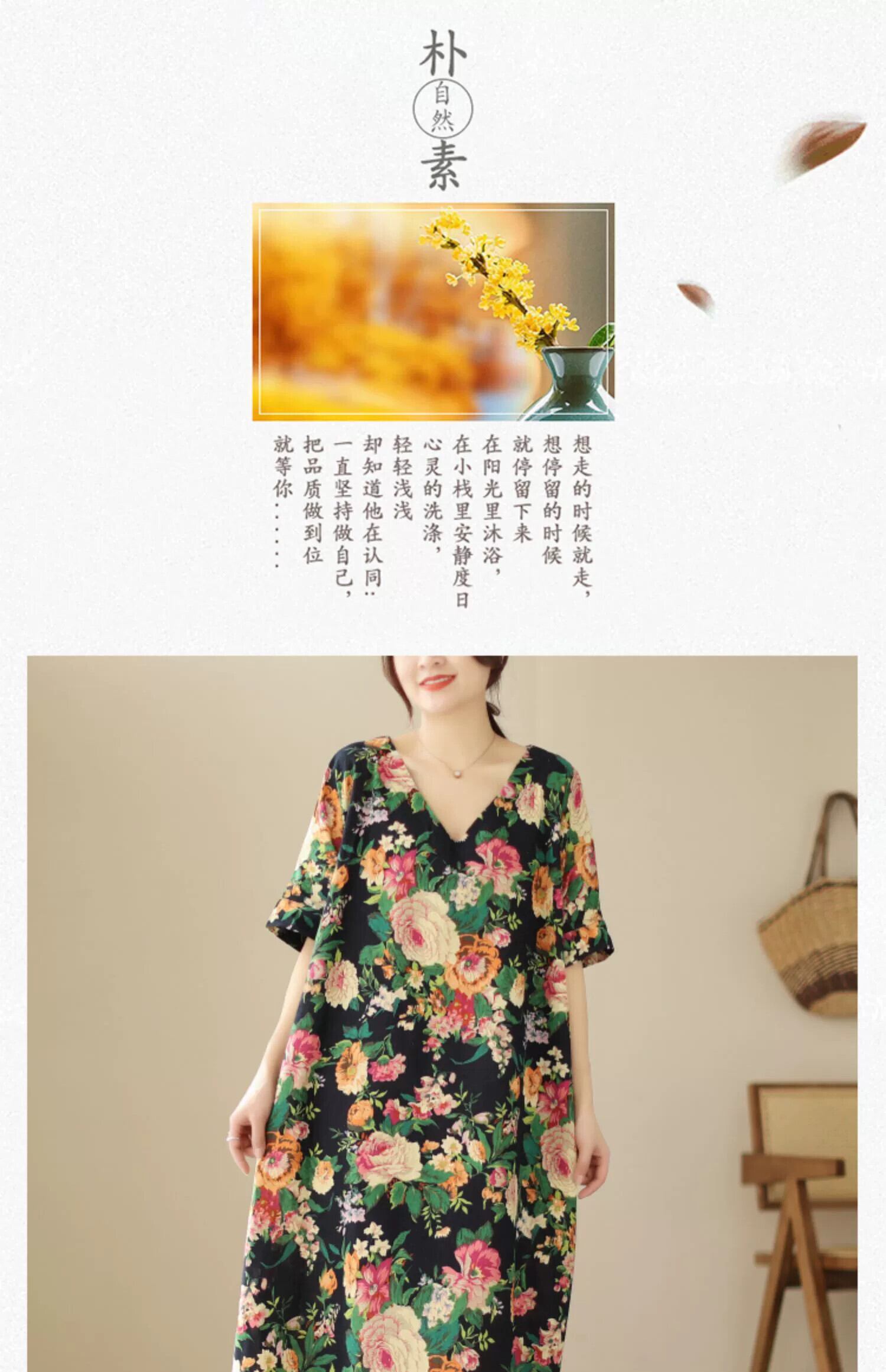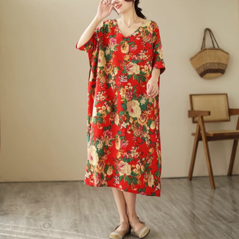 クリアランスブランド牛グッズカウンター最終在庫レディースエスニック風プリント半袖ワンピースゆったり大きいサイズ綿麻ミモレ丈スカート コットン 大きめサイズ sine38294618440