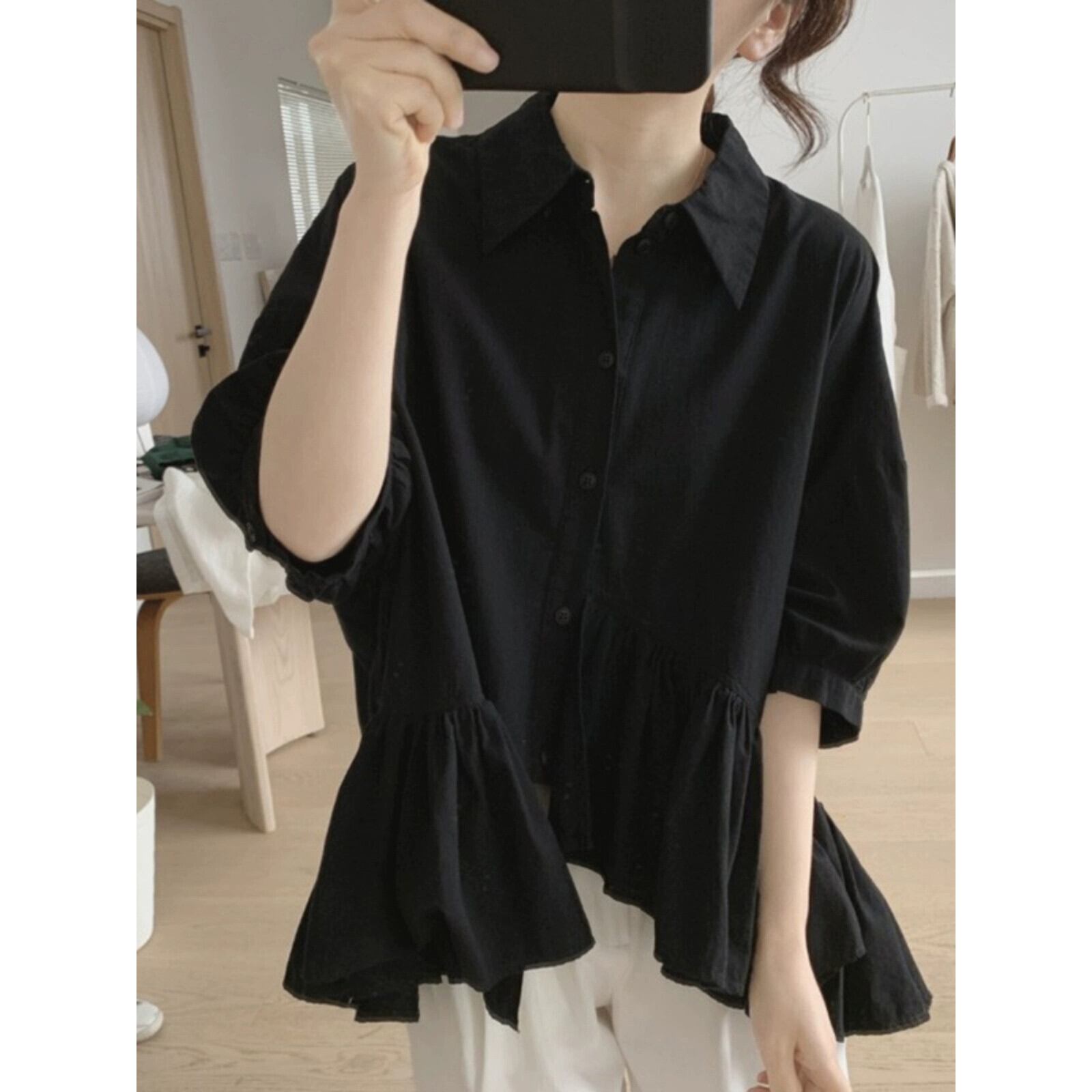 クリアランスリーク〜カウンター最後の在庫不規則なコットンとリネンの半袖シャツレディースサマールーズプリーツラペルリネントップス 夏物 sine19501697283
