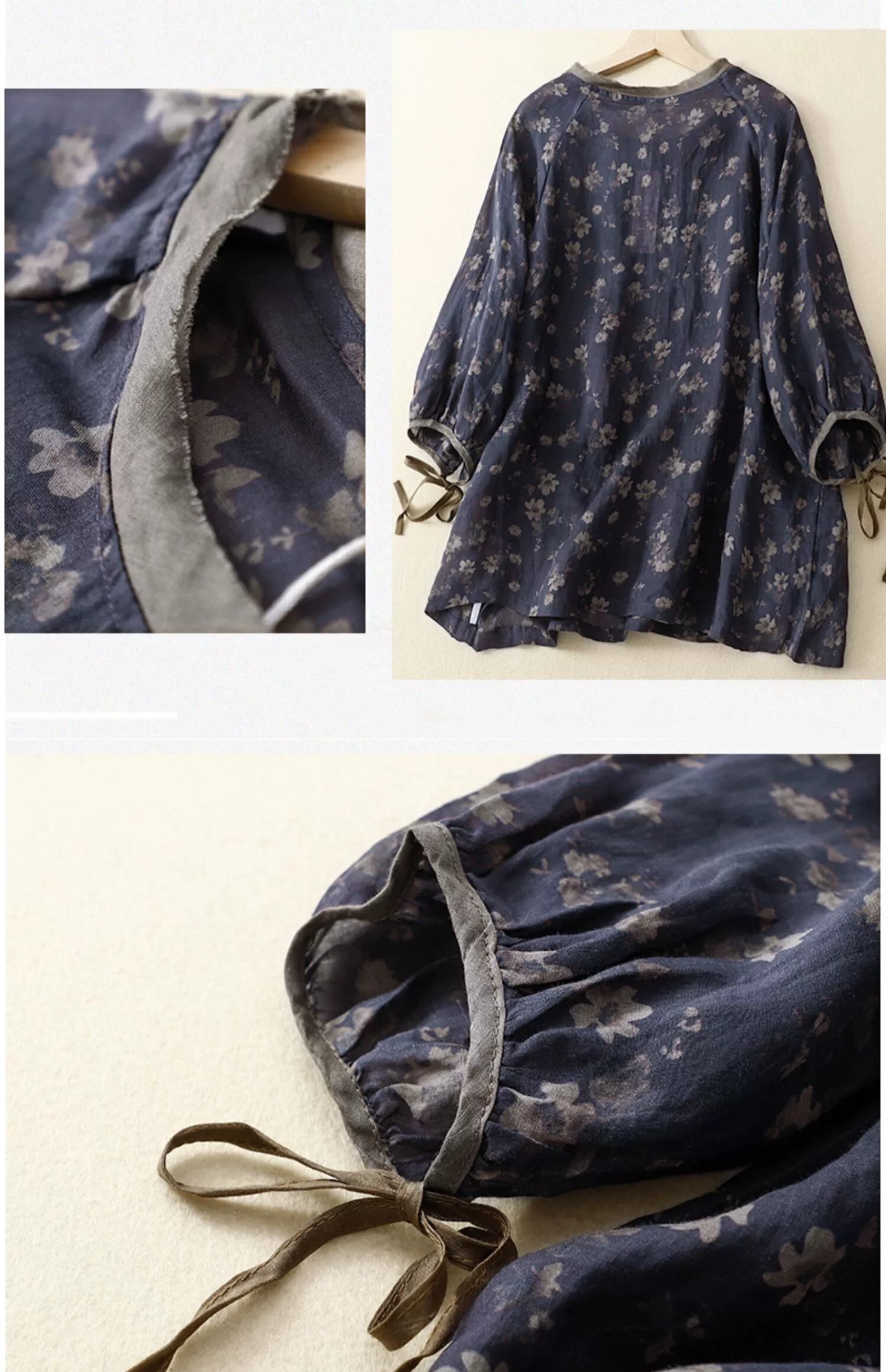 Eign Trade Export Big-name Tail Goods レディース クリアランス レトロ ラミー フローラル シャツ ルーズ カジュアル リネン 七分袖 トップ 花柄 sine95342389449