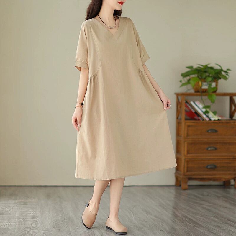 クリアランスカウンター最後の在庫の女性の芸術的なコットンとリネンの V ネックドレス、ルーズでスリムなリネン A ラインのミドル丈スカート Vネック Aライン sine61117610272