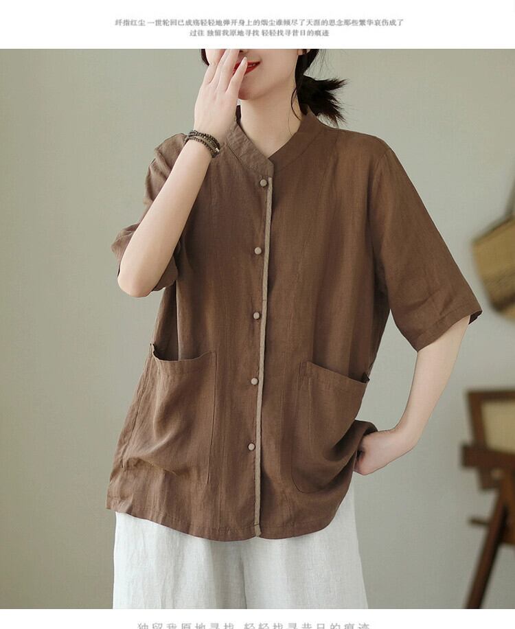 ディスカウント ストア ショッピング モール撤退レトロ綿とリネンのスタンドカラー シャツ女性の夏ルーズ カジュアル リネン半袖トップ コットン サマー 夏物 sine95348518169