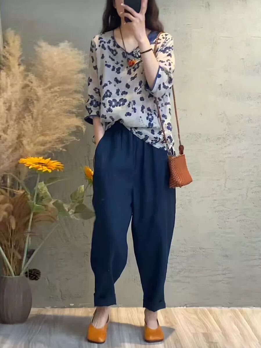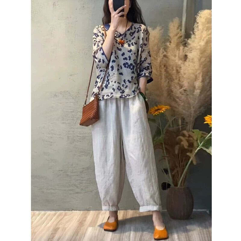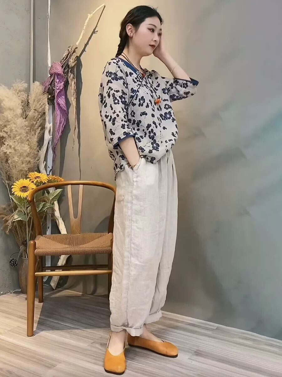 永貿易輸出有名商品綿とリネンプリント半袖 Tシャツトップカジュアルハーレムパンツリネンツーピーススーツ女性 コットン sine82884041270
