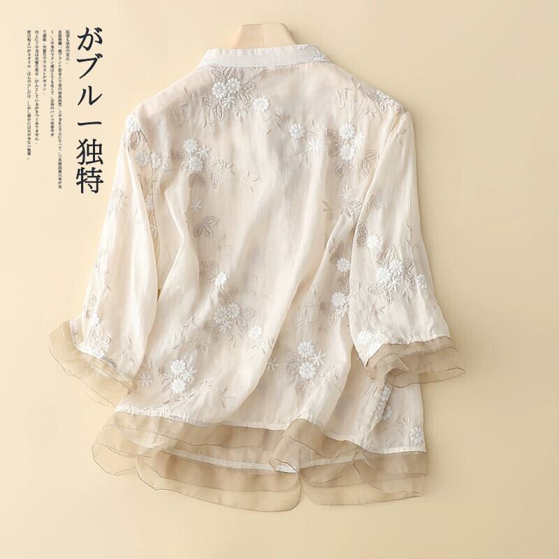 eign trade 割引ブランドテールグッズレトロラミー刺繍シャツ女性のルーズオーガンザコットンとリネン日焼け止めカーディガントップ レッド sine33459444040