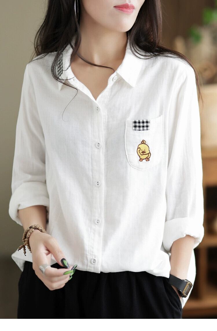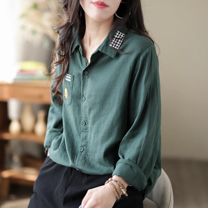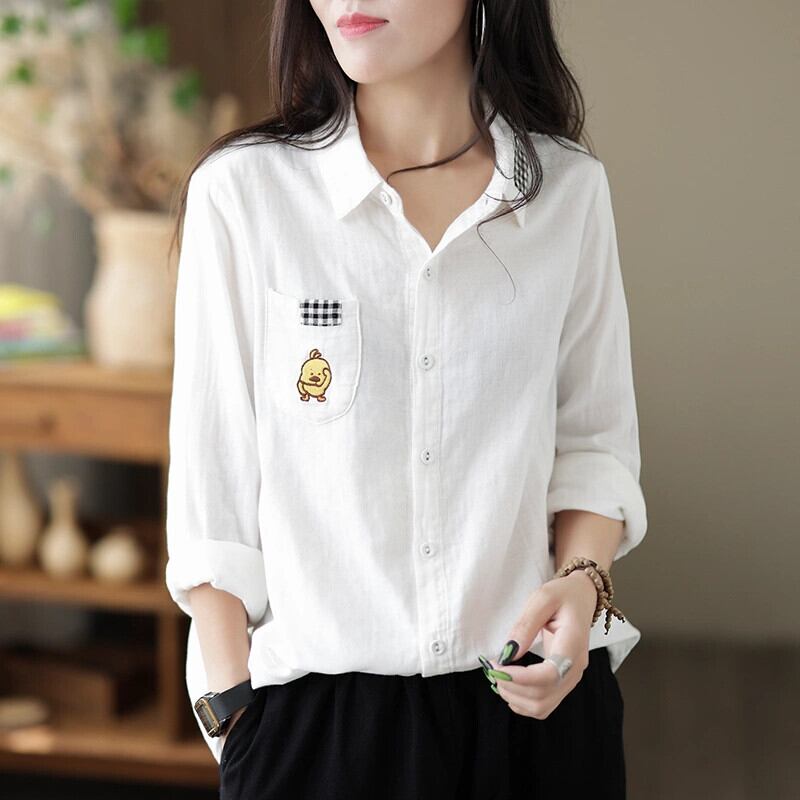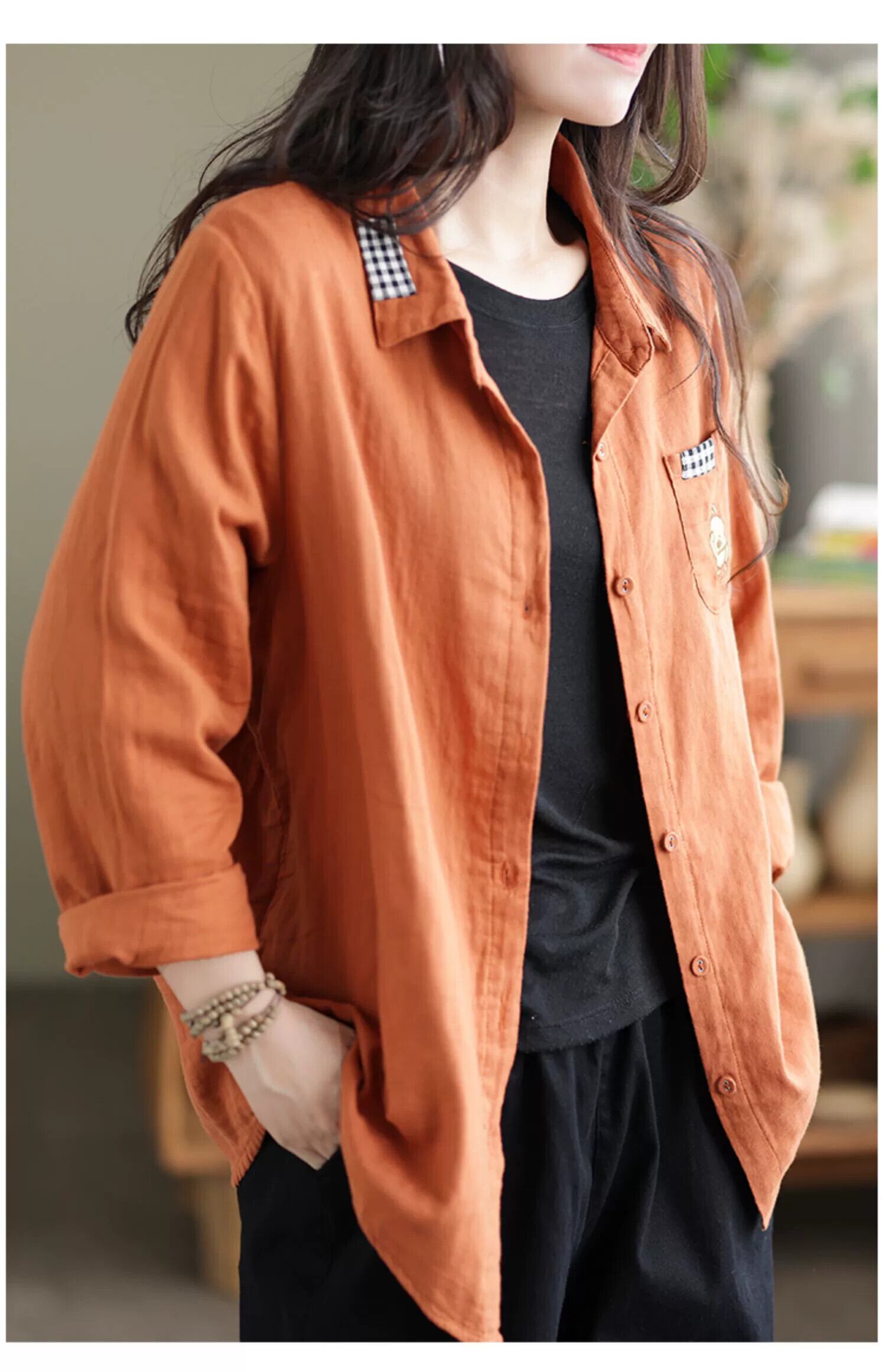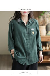 ディスカウントストアショッピングモール撤退レトロパッチ綿とリネン長袖シャツレディースルーズカジュアルリネンラペルトップ ロング コットン sine404994018