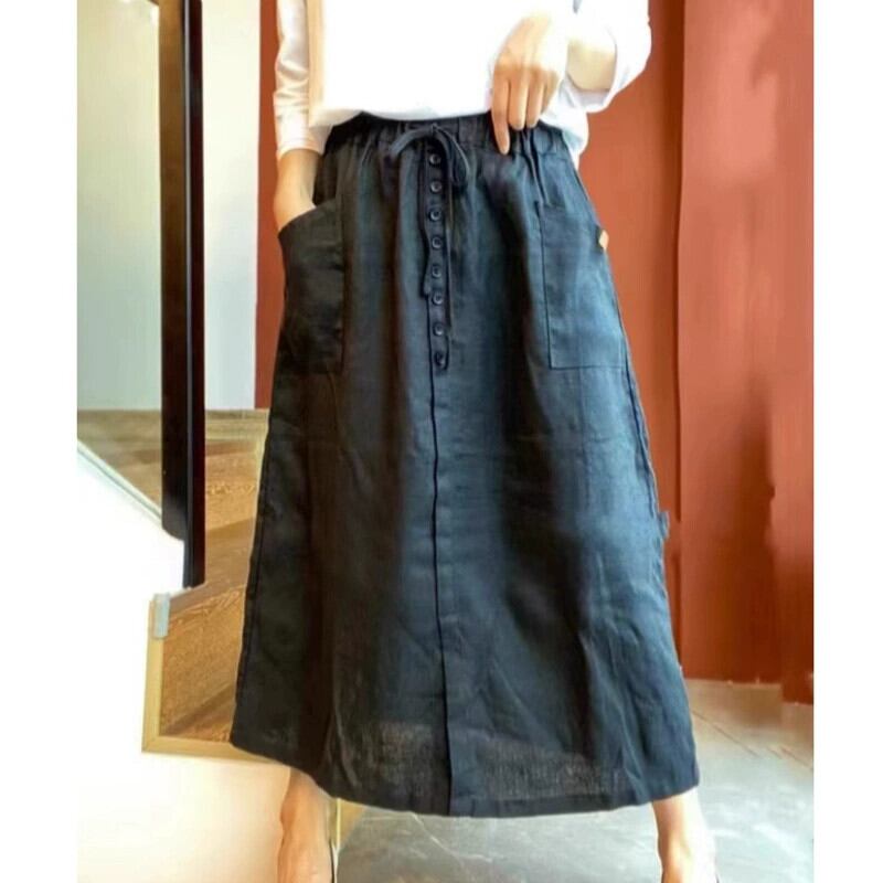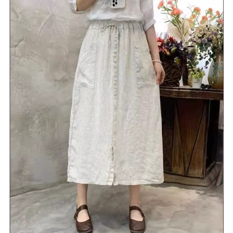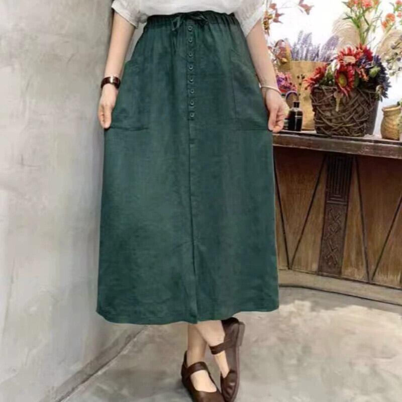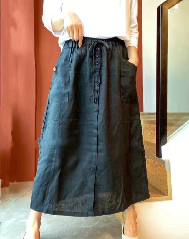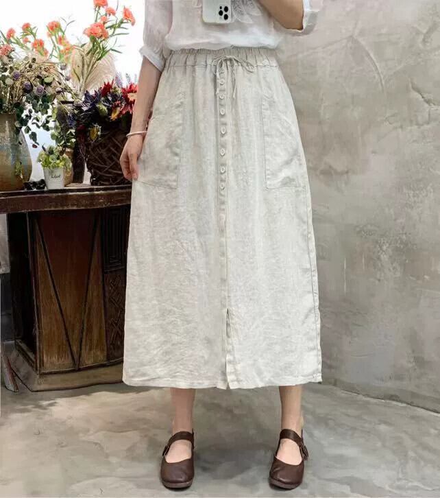 ディスカウントストアの有名カウンター引き出しクリアランスレトロコットンリネンスカートレディースハイウエスト巾着リネンAラインミドル丈スカート sine23268249159