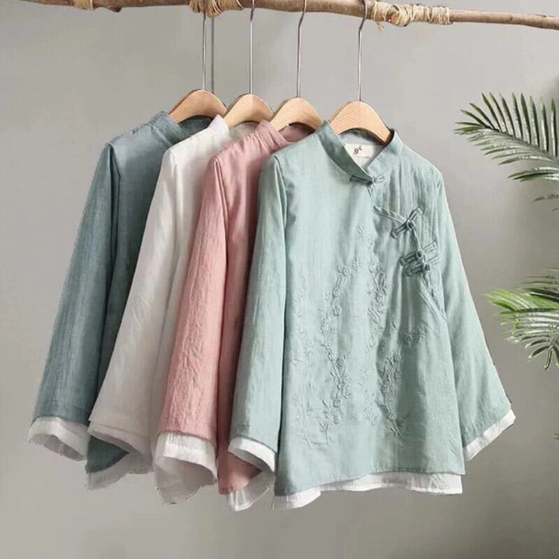 永貿易輸出大ブランドテール商品がキャビネットから撤収された新しい中国風の斜めの襟ボタンのティートップ女性の緩い綿と麻のスタンドアップカラーシャツ コットン sine92909259131