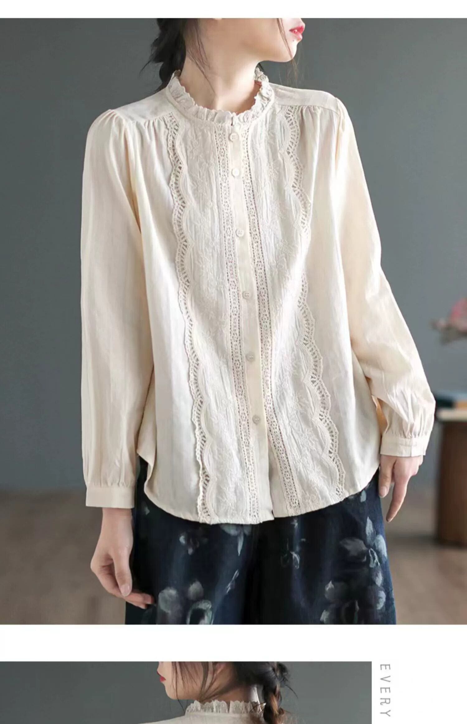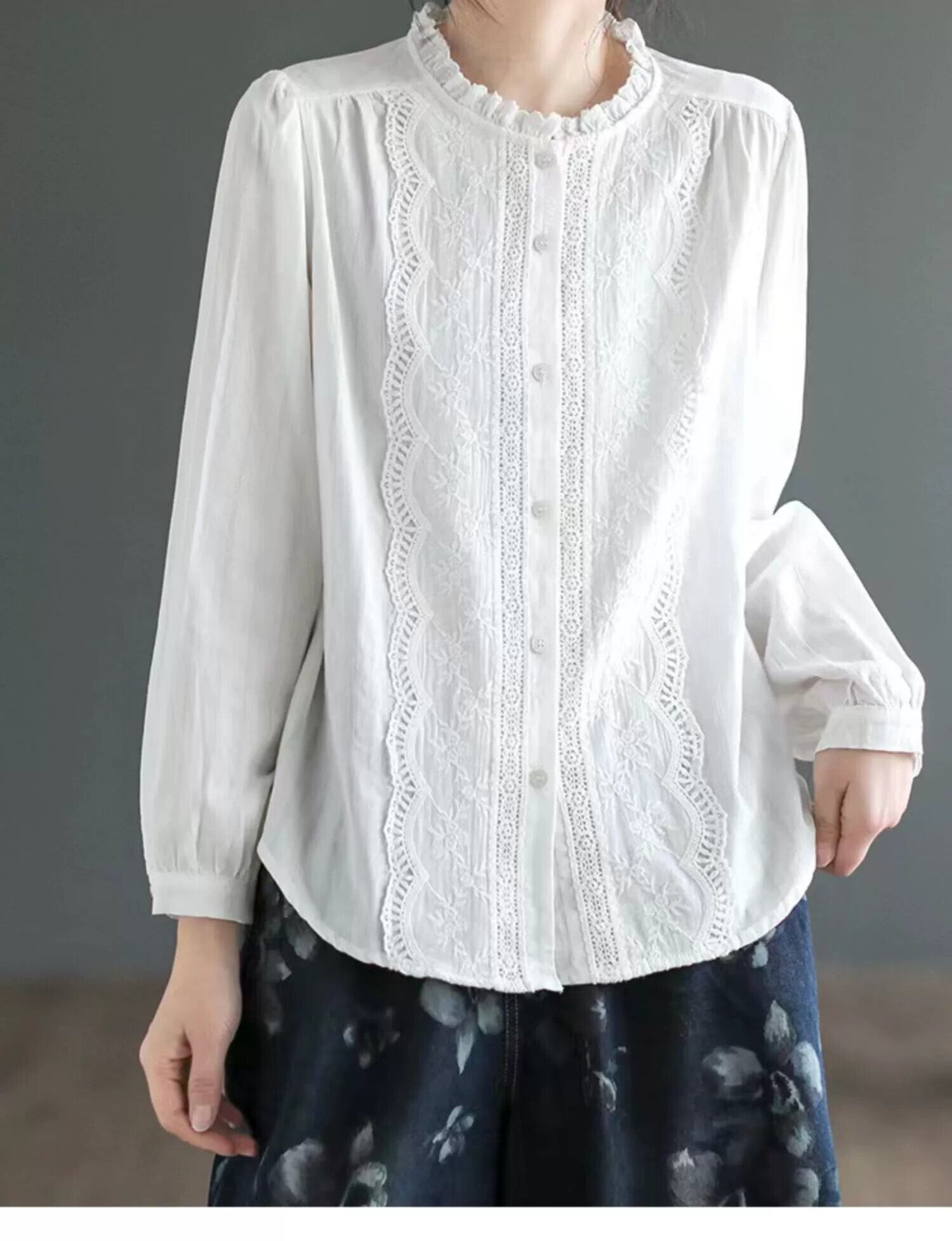 eign trade ese big-name カウンター 在庫切れ レディース レトロ ファンガス レース コットンとリネン シャツ ルーズ リネン 長袖 トップ ロング sine93896027138