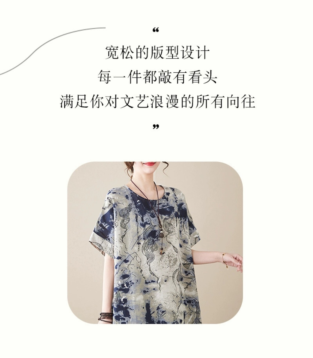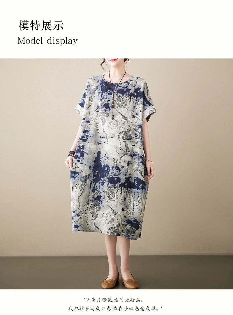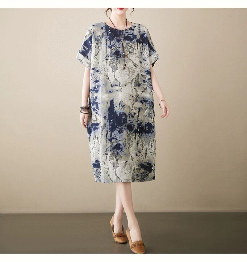 ファーストラインブランド eign trade 最終在庫レディース エスニック風プリント半袖ワンピース ゆったり 大きいサイズ 綿麻 Aラインスカート コットン 大きめサイズ sine74217097919