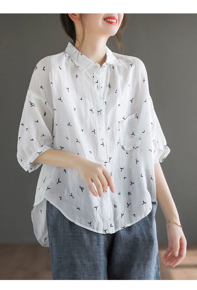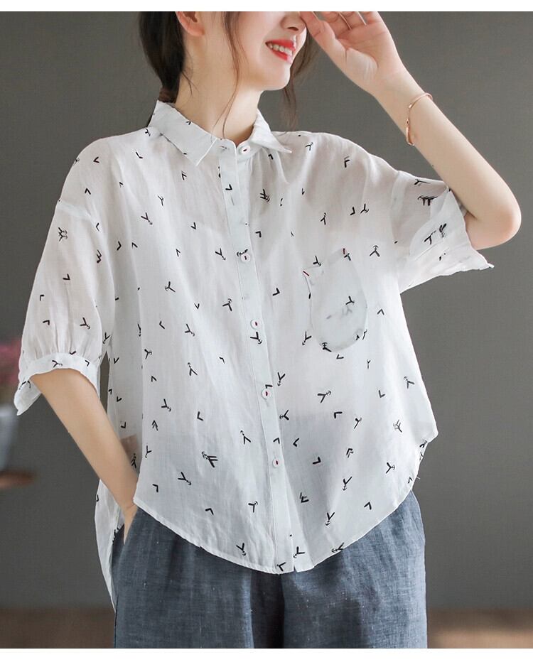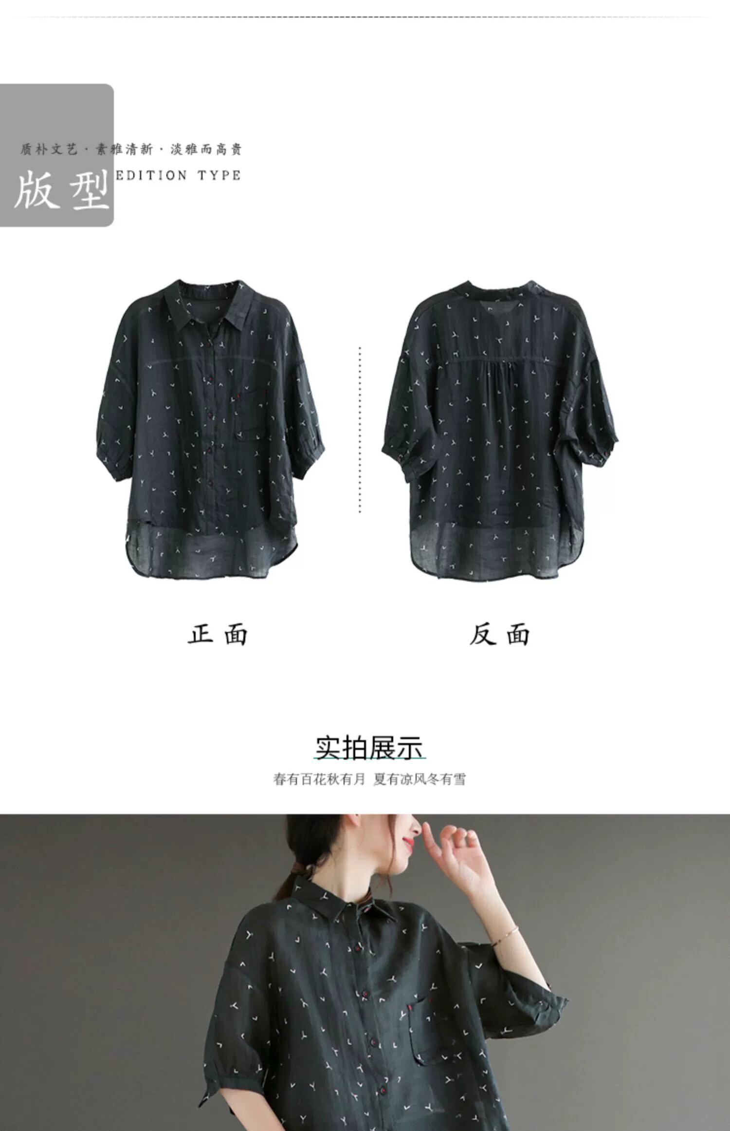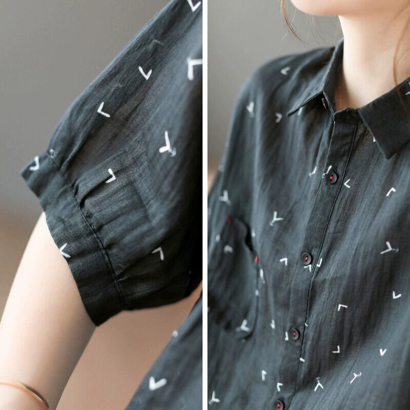 ディスカウント ストア ショッピング モールの女性のカジュアル プリント コットンとリネンの半袖シャツ、ルーズで軽いラペルのリネン トップス sine32637096590