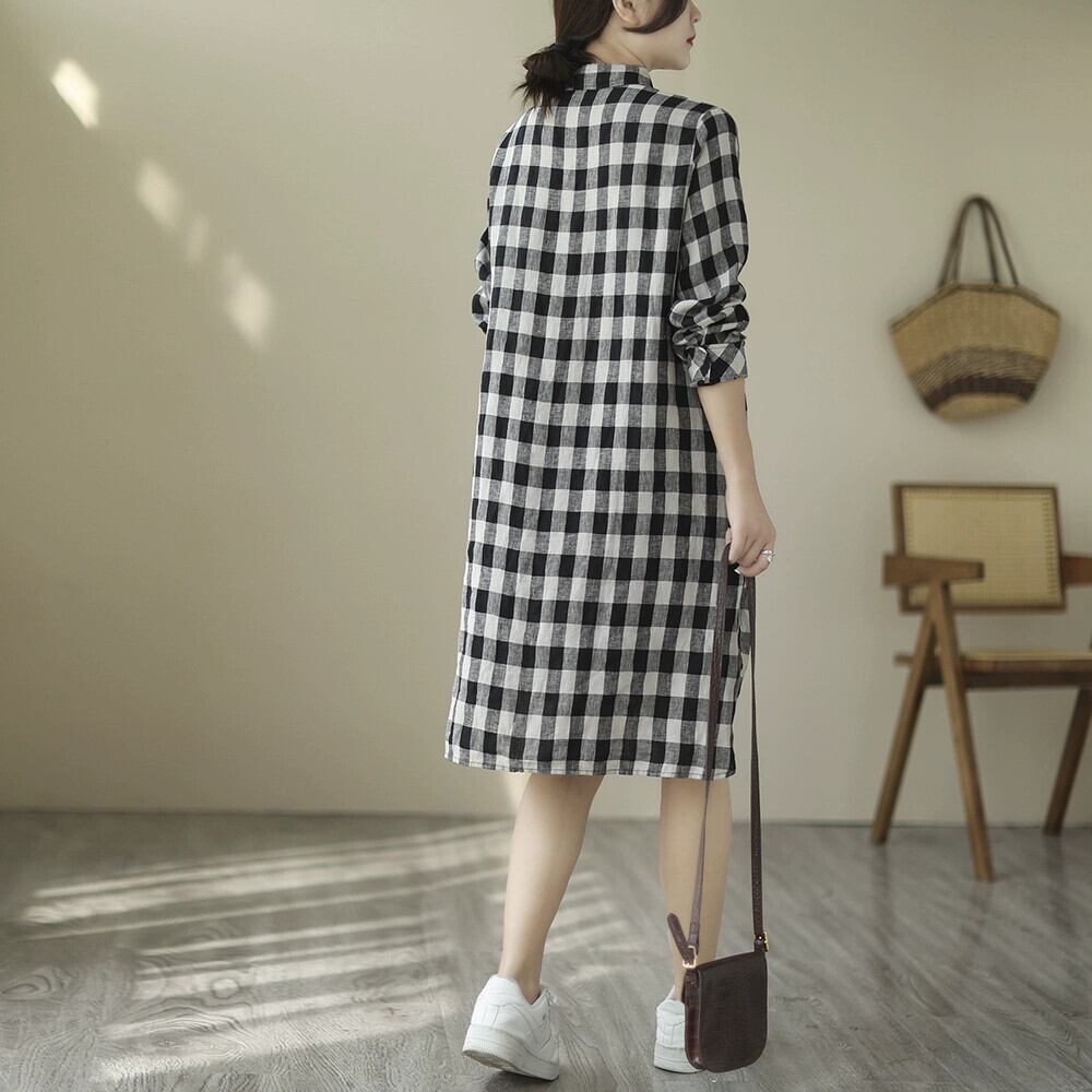 ese とオリジナルの有名な商品の女性のカジュアル文学チェック柄コットンとリネンのシャツスカートルーズミッドレングスリネントップ秋 オータム 秋物 sine36145873345