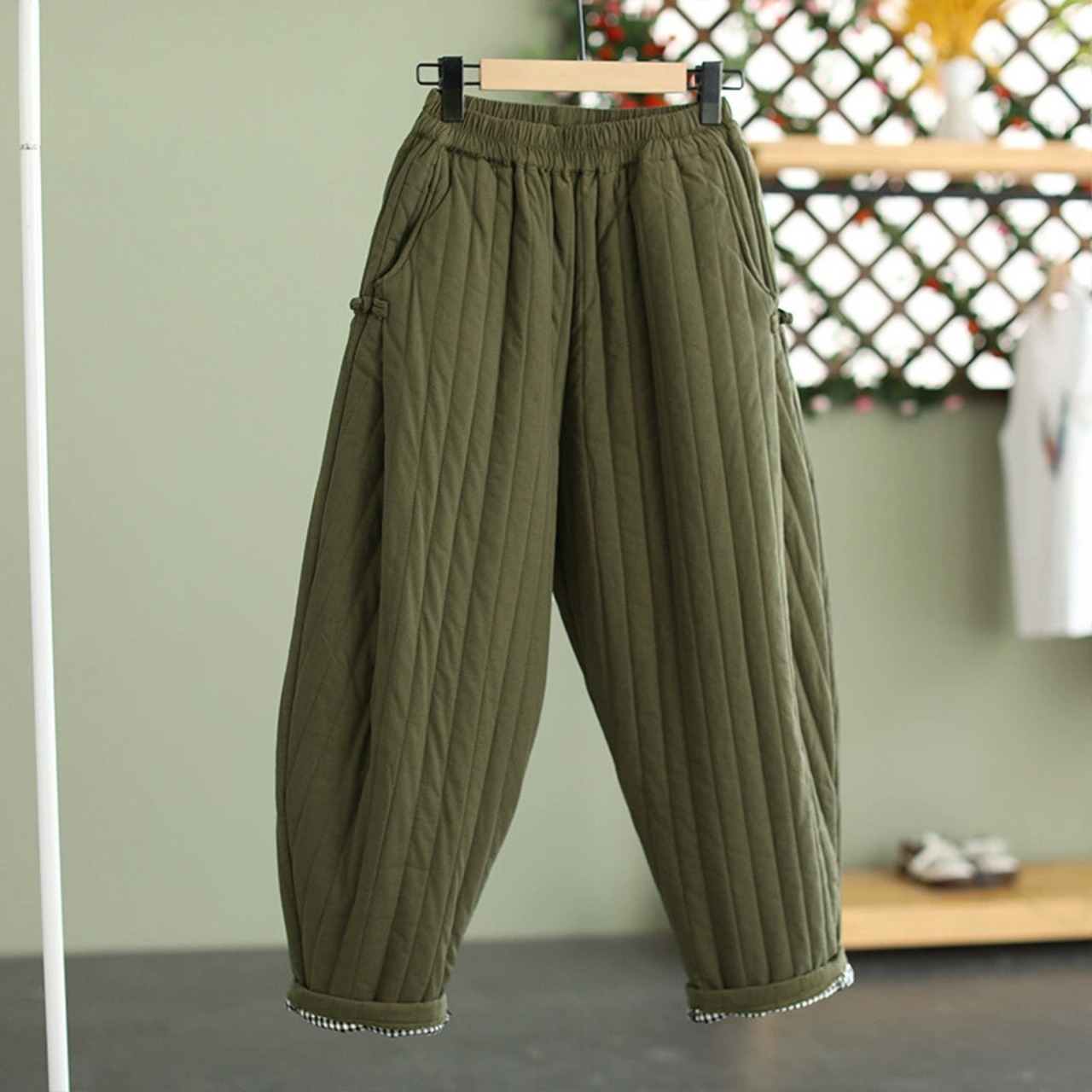 クリアランスピックアップカウンターの有名な女性のレトロなハイウエストバックル軽量ダウンコットンパンツルーズストライプキルティングハーレムパンツ sine71385691928