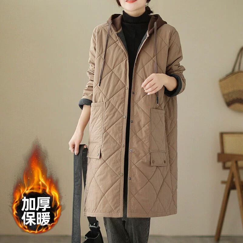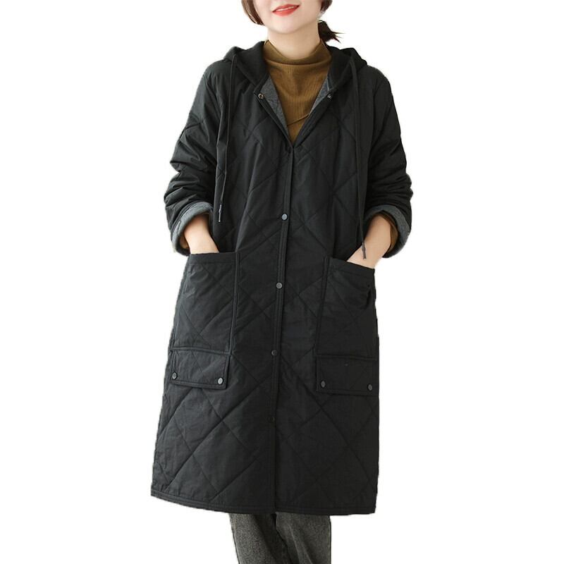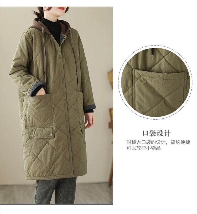 特別オファー〜レトロなキルティングのミドル丈のフード付きコットンジャケット、ゆったりとした大きいサイズ、厚くて暖かい菱形のコットンジャケット 大きめサイズ sine91834470422