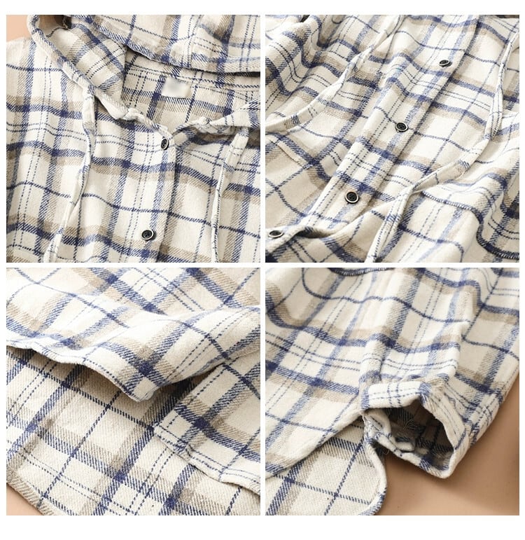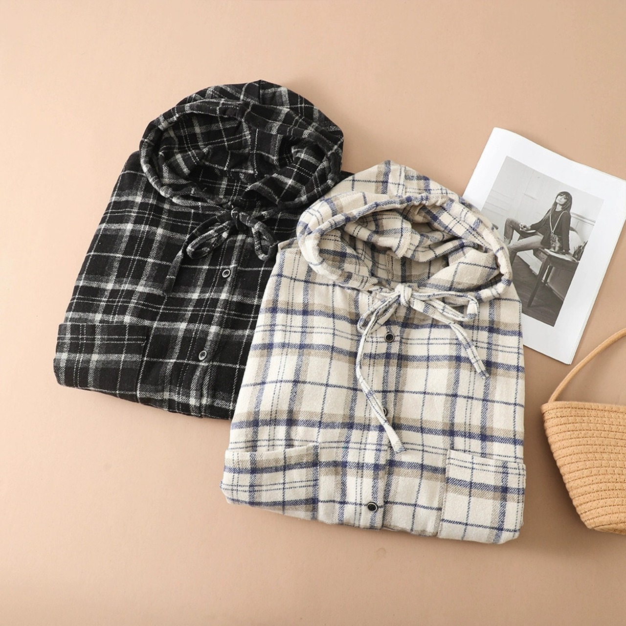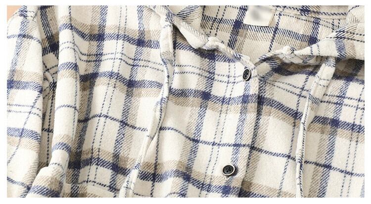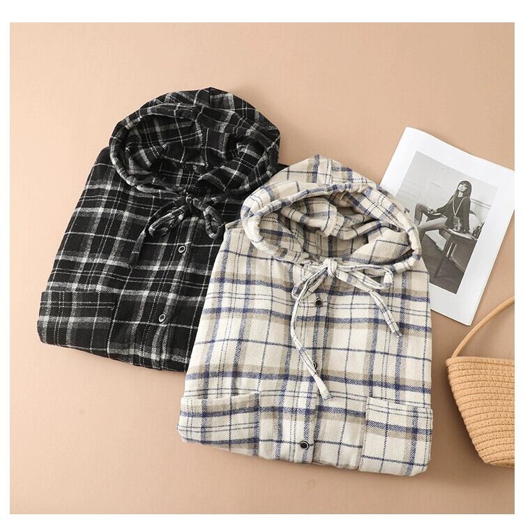 Eign Trade Export Big Tail Goods 撤退フード付きチェック柄シャツジャケット女性のルーズカジュアル長袖シングルブレストスウェットシャツ ロング sine56519258248