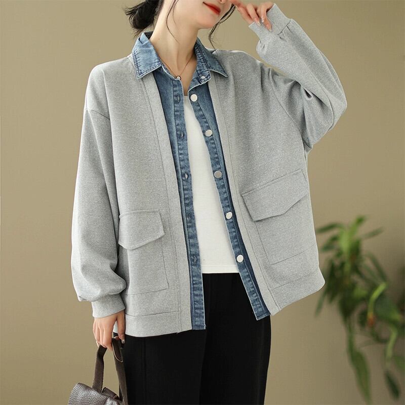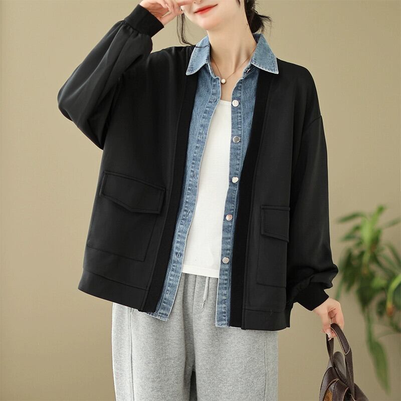 ディスカウントストアショッピングモールの女性のファッションスプライシング偽ツーピースデニムジャケットルーズ長袖野球ユニムトップ ロング sine31083227742