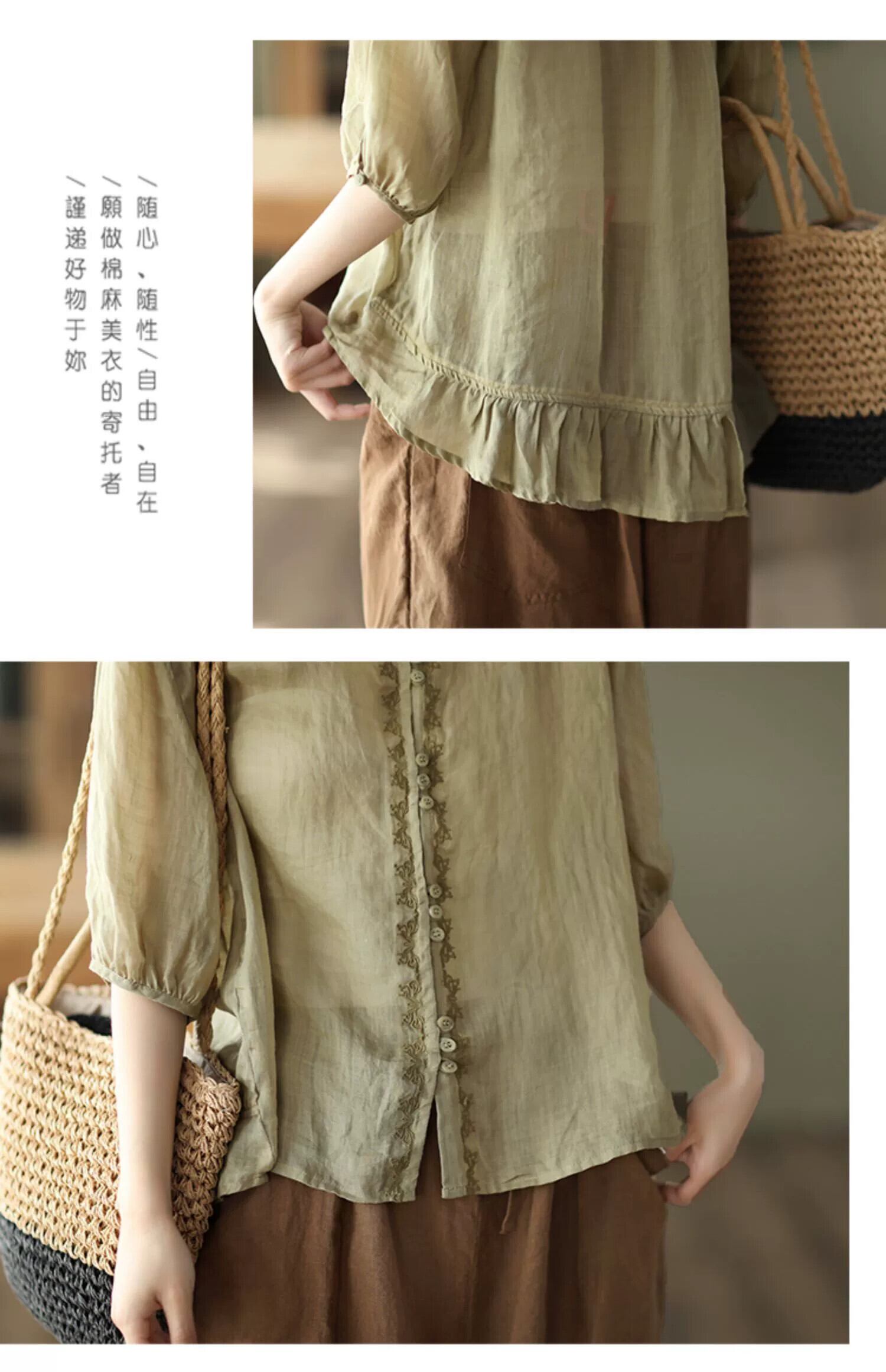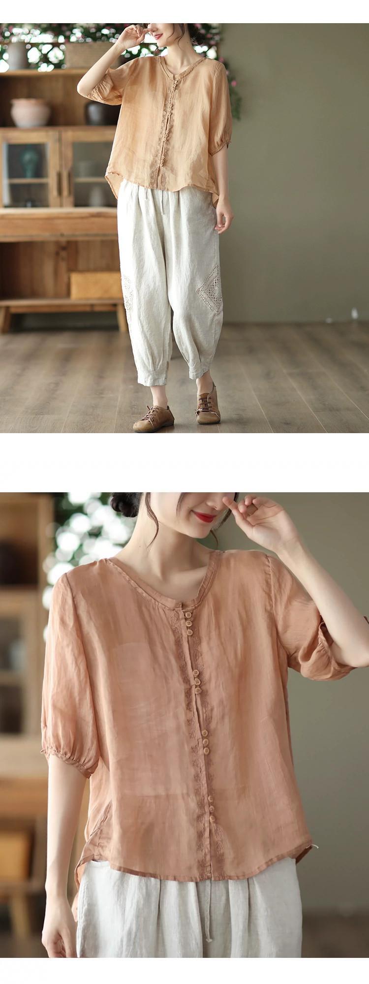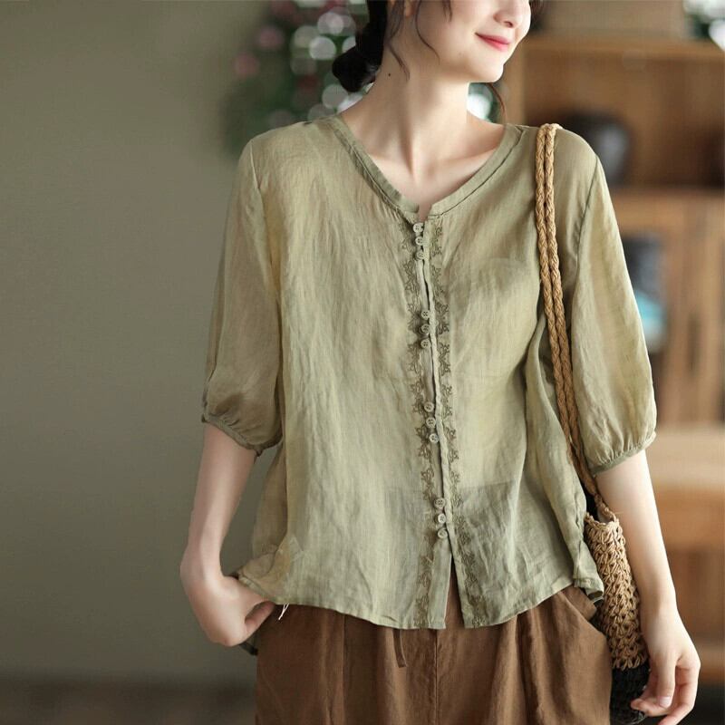 Eign Trade Export ビッグネーム カットオフ シングル レディース レトロ コットンとリネン 刺繍入り 半袖シャツ ルーズ V ネック ラミー トップ 薄手 レッド Vネック sine30636763631