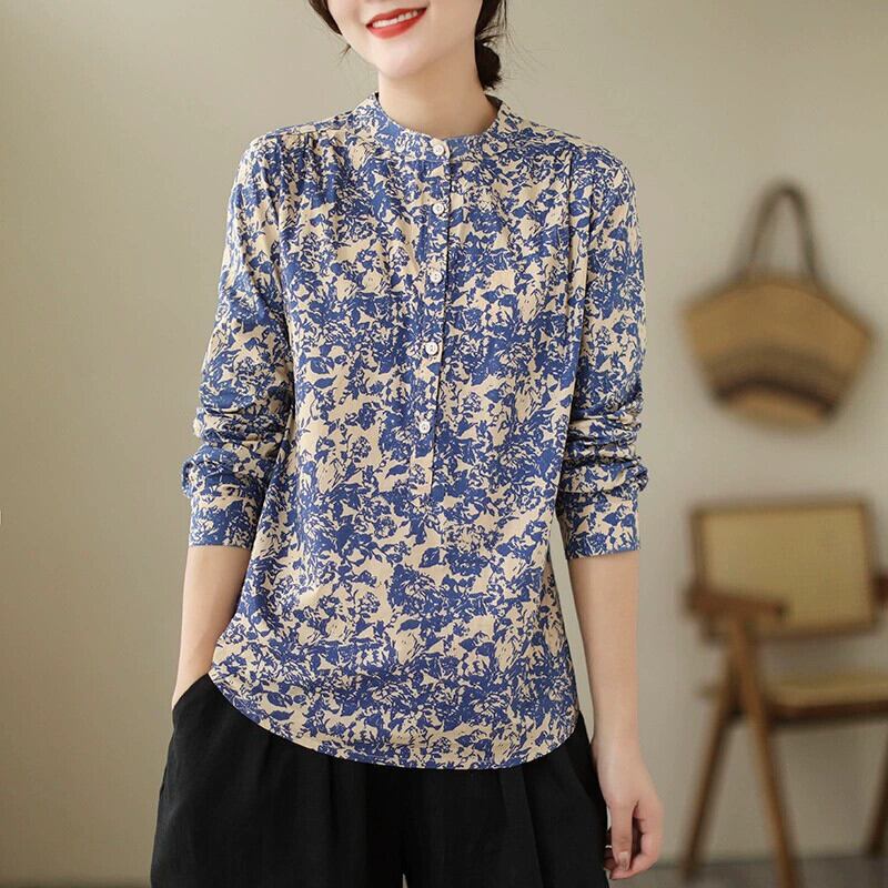 ディスカウントストアの有名カウンター引き出しクリアランスレディースレトロフローラルスタンドカラートップルーズスリミングコットンとリネン長袖シャツ ロング 花柄 sine67789338185