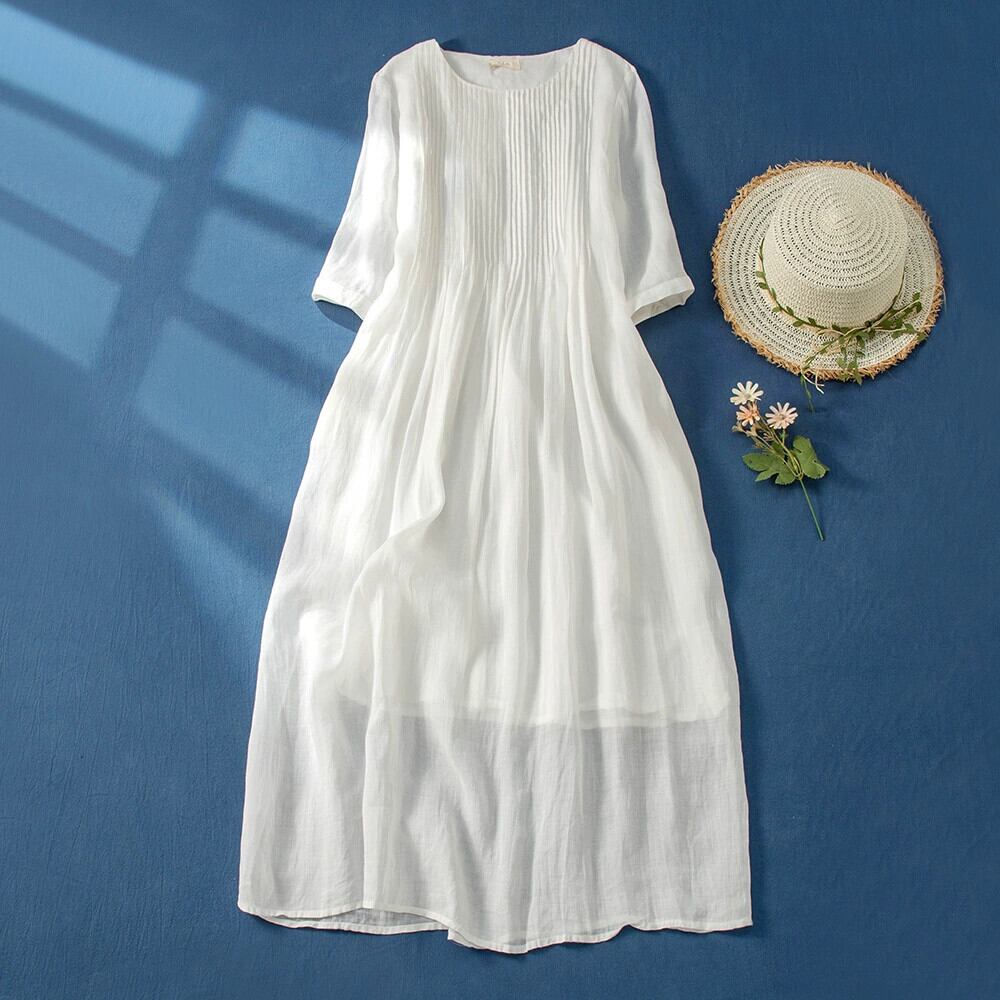 eign trade ese ビッグネームカウンターレディースアコーディオンプリーツラミー半袖ミドル丈スカートルーズリネンワイドヘムドレス sine42014032713