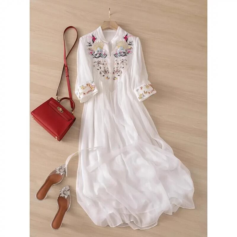 eign trade 割引ブランドテールグッズエスニックスタイル刺繍綿とリネンドレスルーズレースアップエレガントなリネンロングスカート レッド コットン sine37671287808