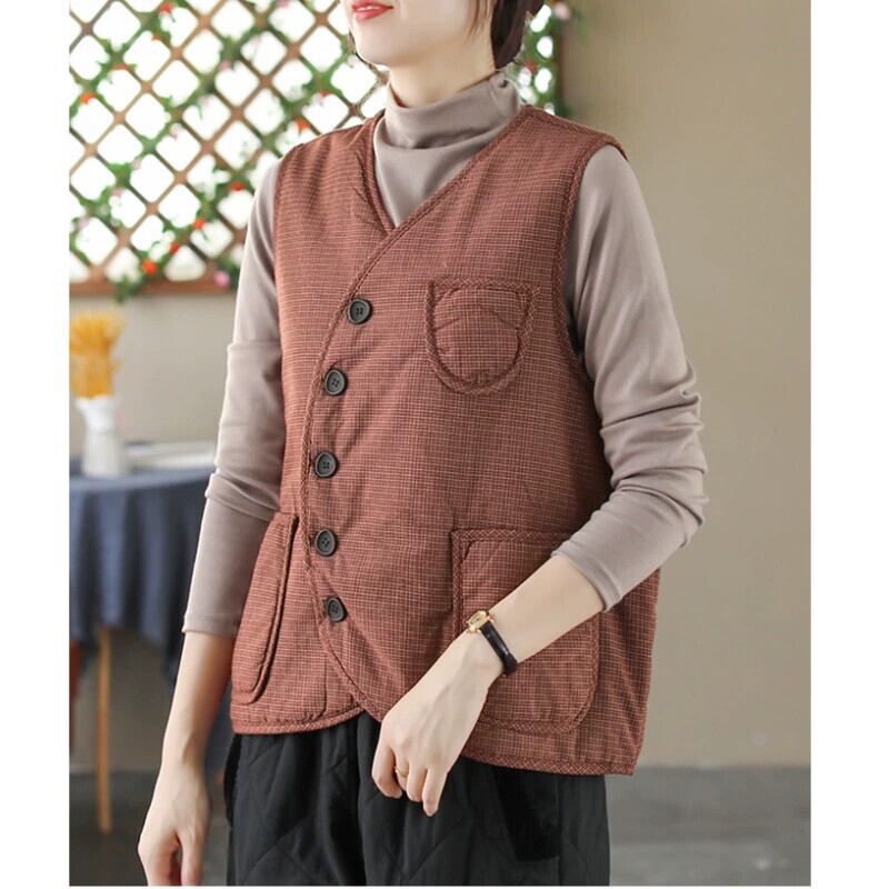 ディスカウントストアショッピングモールレトロキルティングベスト女性厚くて暖かい層状チェック柄コットンコート レッド sine24438281885