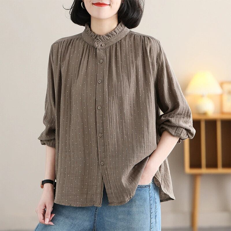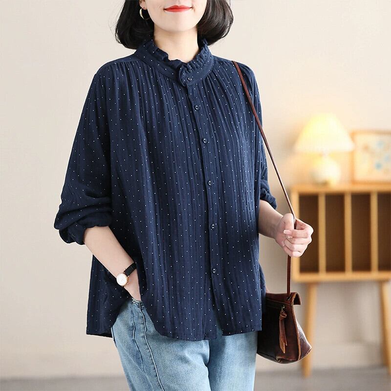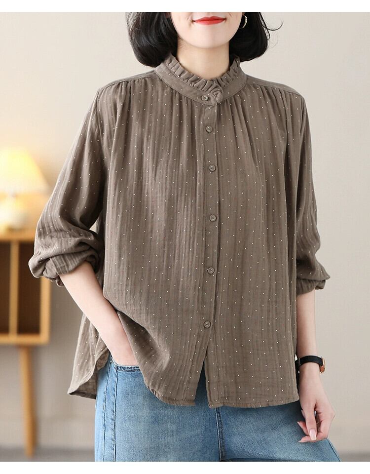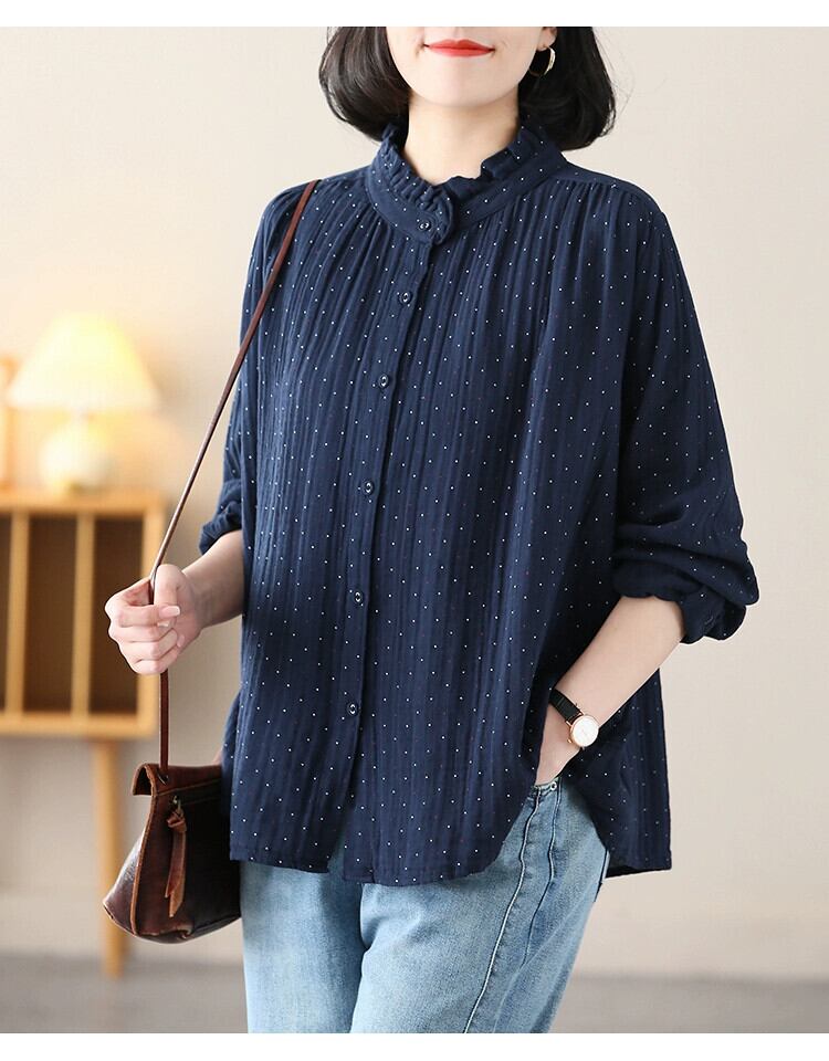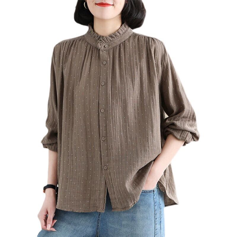 クリアランス漏れ〜有名カウンターグッズ、レディースレトロ水玉レーススタンドアップカラートップ二層綿ガーゼ長袖シャツ ロング コットン sine36043150968